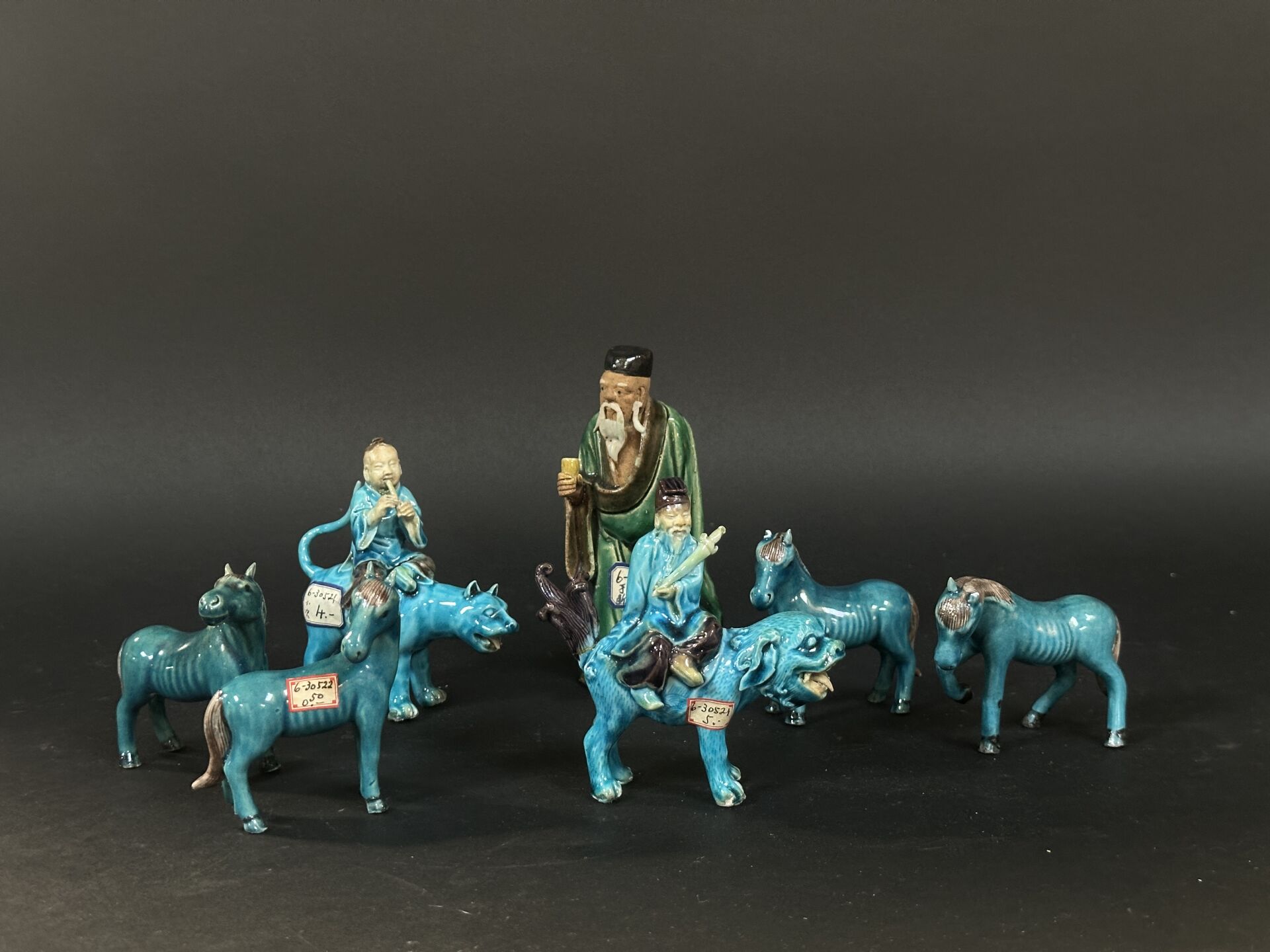 Réunion de sept sujets en céramique émaillée notamment turquoise, figurant des chevaux,...