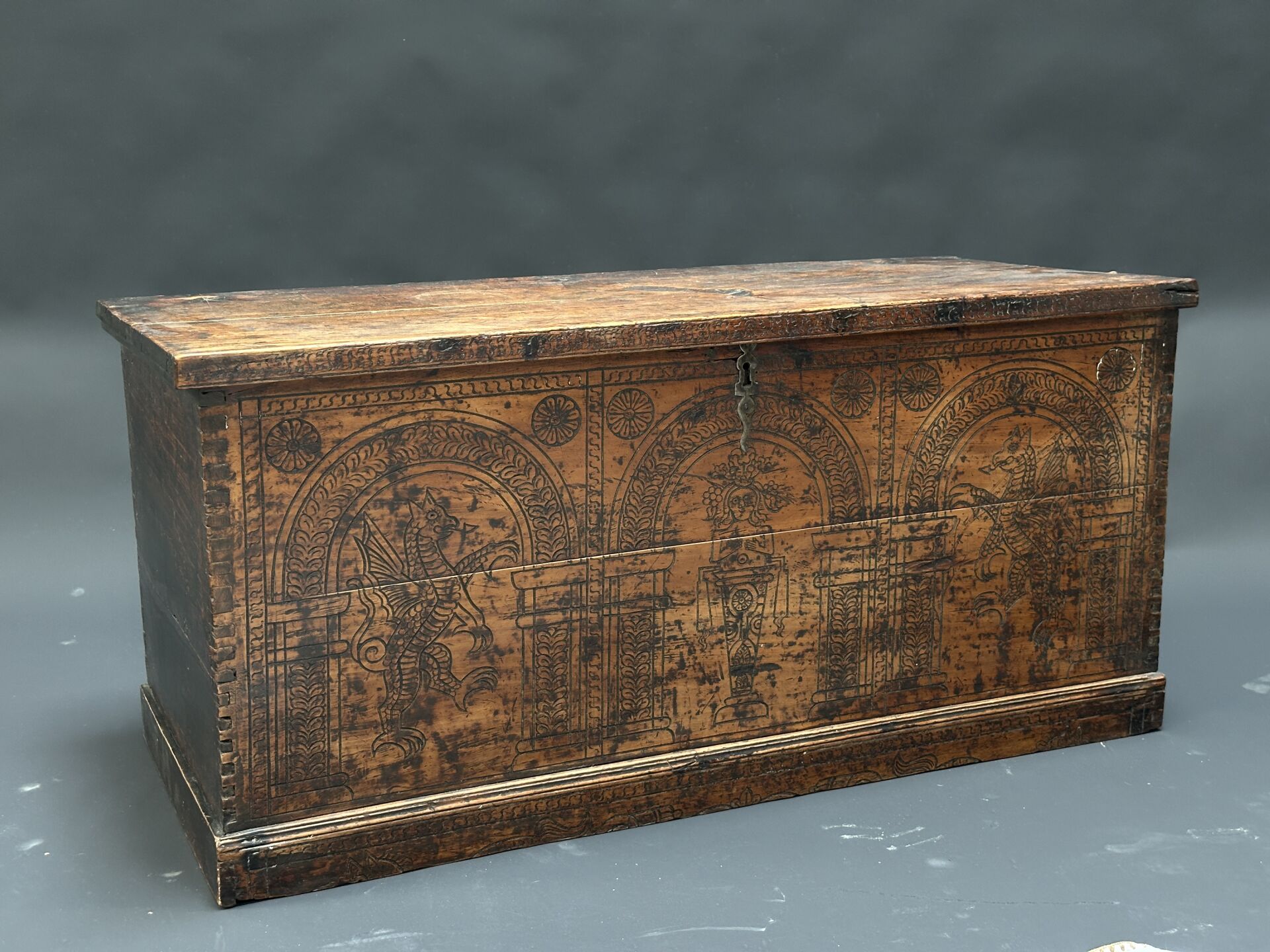 Coffre de mariage en bois vernis à décor pyrogravé d’arches abritant des personnages...