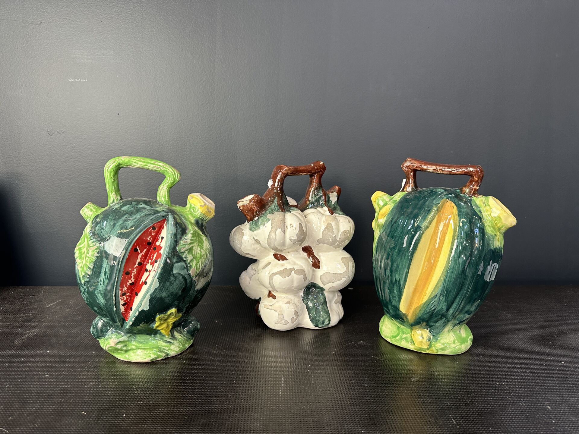 Réunion de trois pichets en barbotine figurant une pastèque, un melon (?) et une grappe de...
