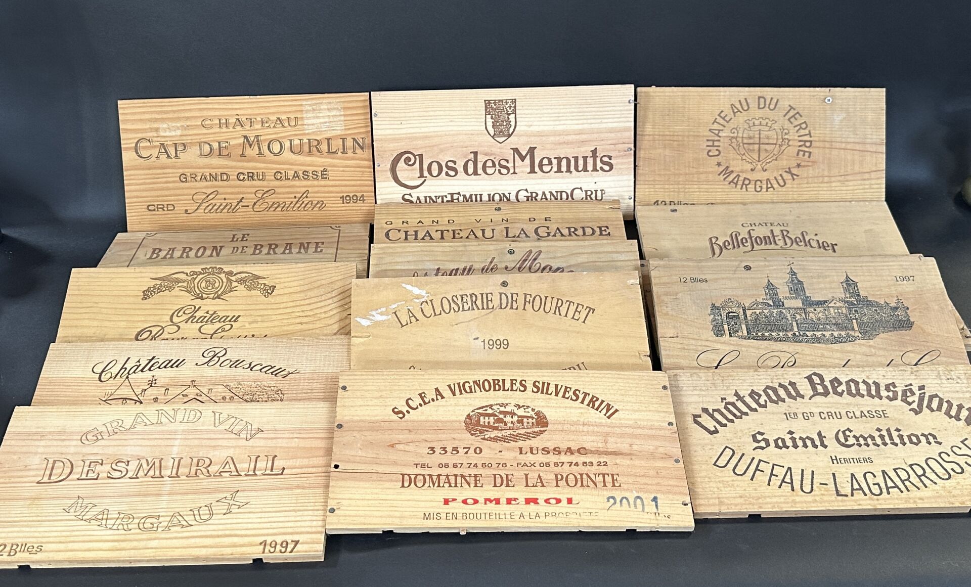 Réunion de quinze planches en bois de caisses de vin dont Pomerol, Saint Emilion et Margaux.