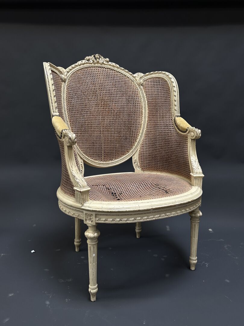 Paire de fauteuils cabriolets en bois mouluré, laqué blanc (usures), le dossier médaillon, les...