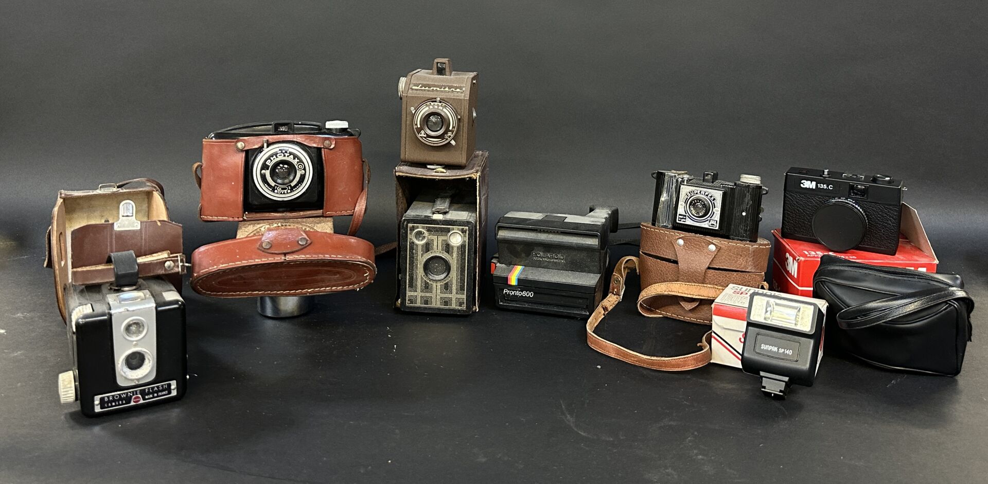 Ensemble de sept appareils photos et un flash dont POLAROID, SUPERFEX.