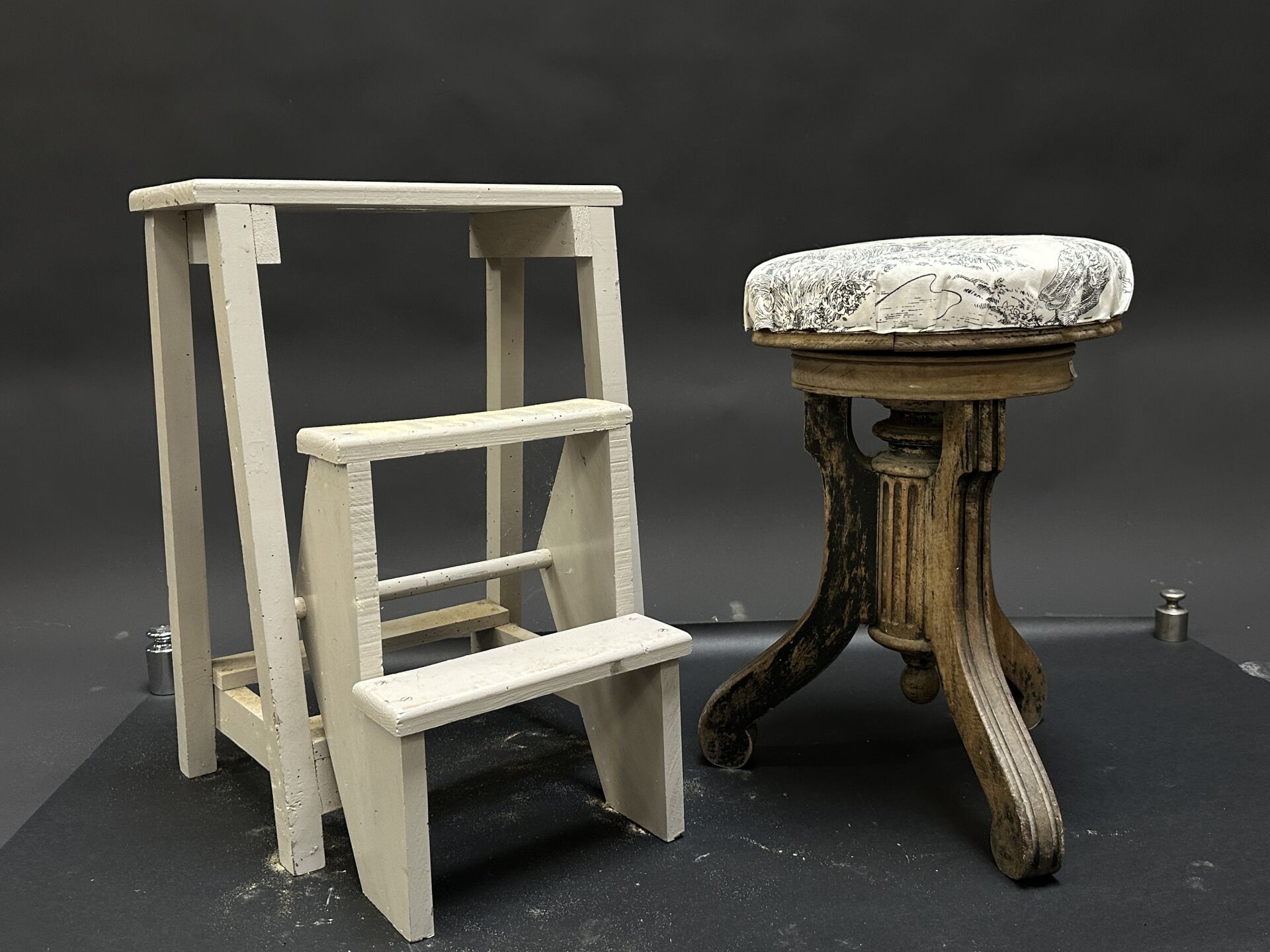 Réunion d’un escabeau de bibliothèque en bois laqué gris et d’un tabouret de piano...