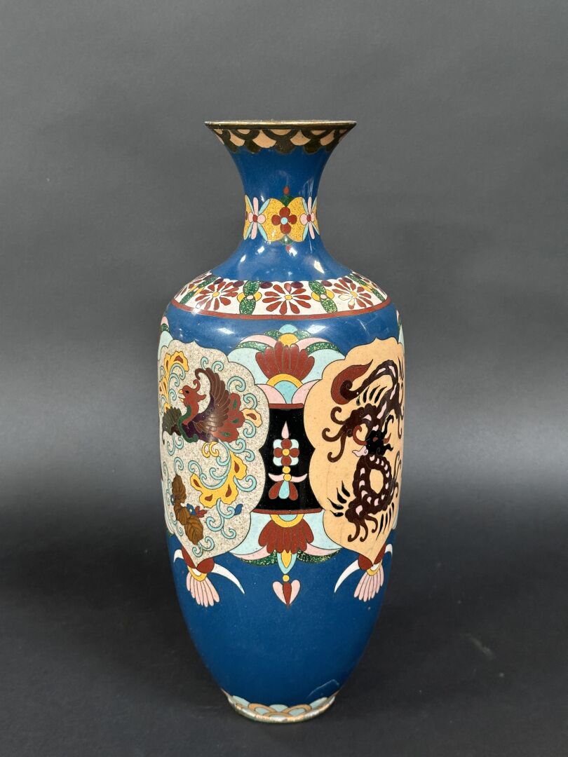 Vase en cuivre et émaux cloisonnés à décor polychrome de phénix et dragons dans des...
