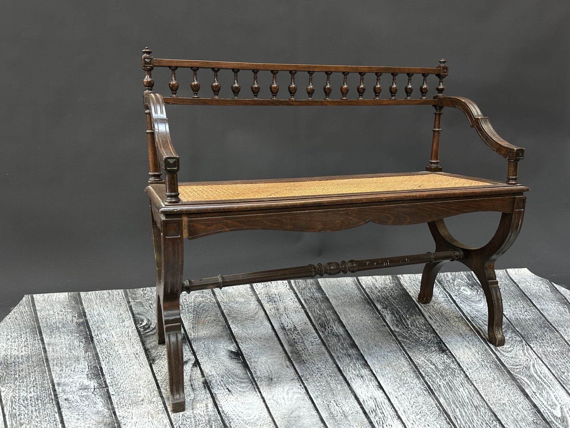 Banc en bois vernis, assise cannée, piètement curule réuni par une barre d’entretoise,...