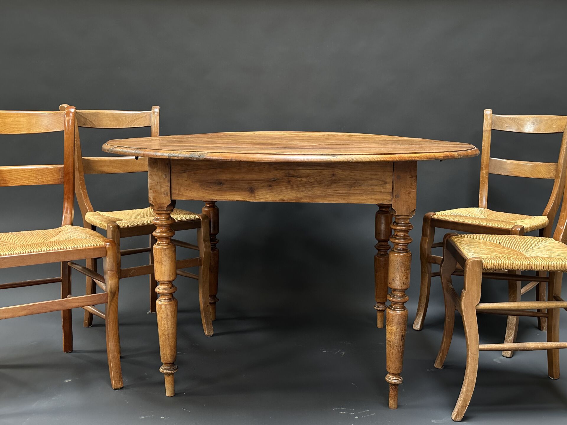Table ronde en chêne à deux allonges, les pieds tournés (état d’usage, accidents). Adjugé à : €