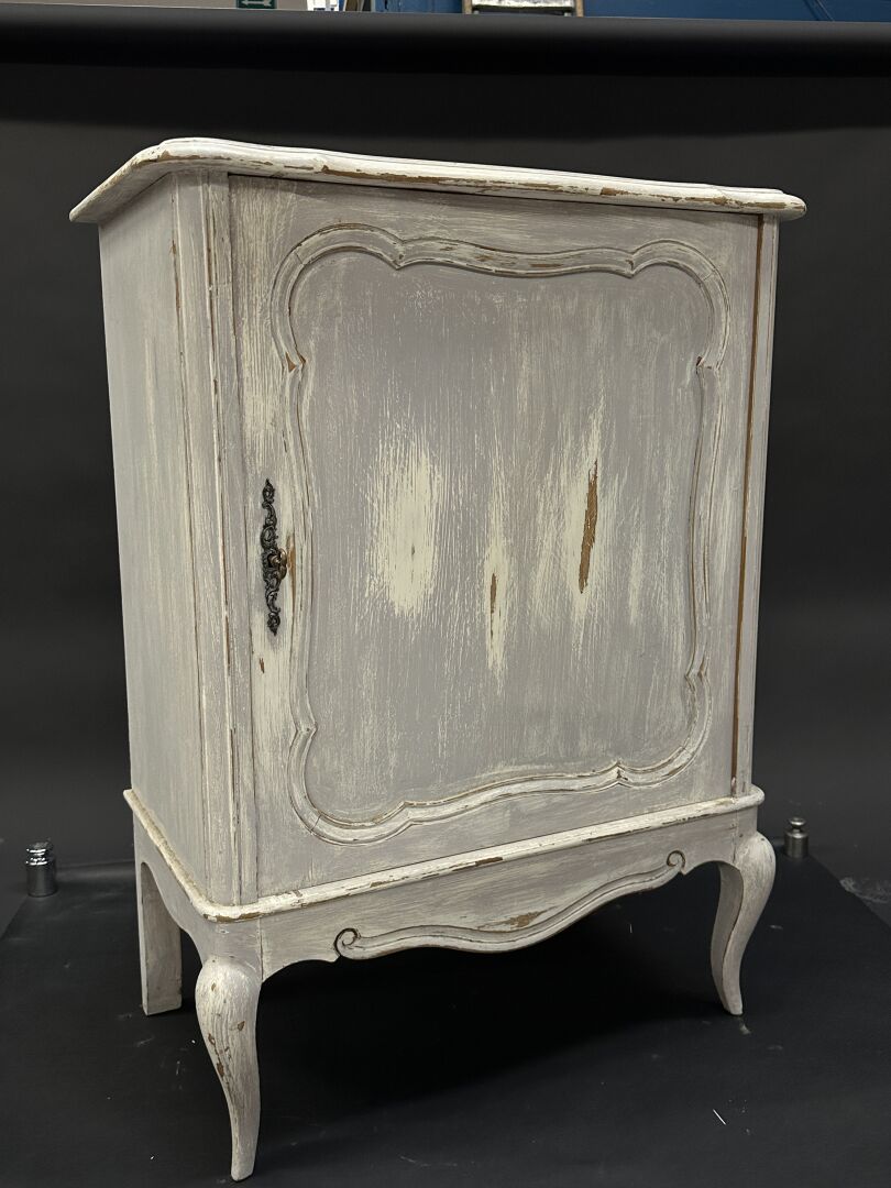 Confiturier en bois relaqué gris cérusé, mouluré, ouvrant par une porte, pieds galbés.