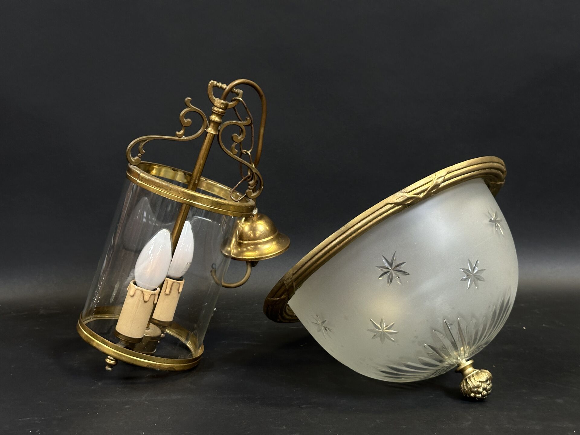 Réunion d’une lanterne de vestibule en laiton doré et verre et d’une suspension en...