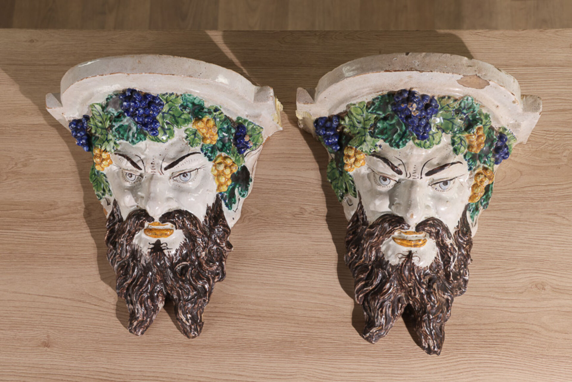 Paire de consoles d’appliques en majolique à décor polychrome de tête de Bacchus aux...