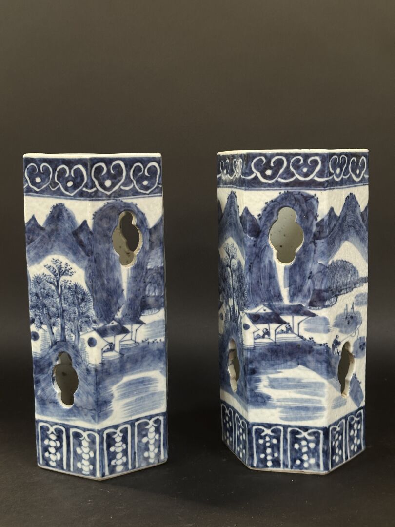 Paire de porte-chapeaux en porcelaine bleu blanc. De section hexagonale, la panse ajourée et...