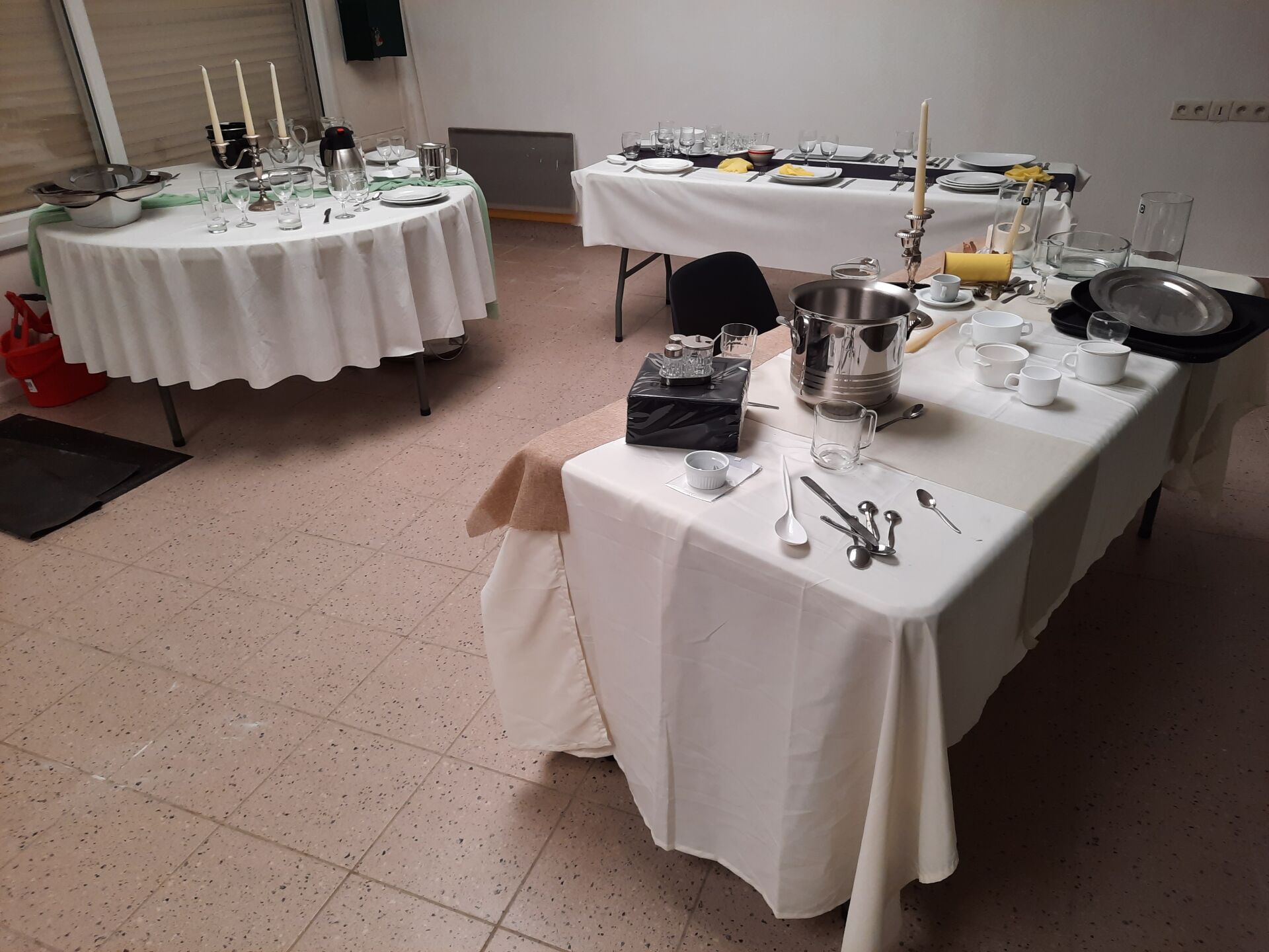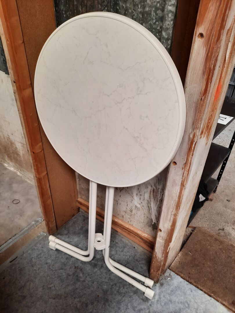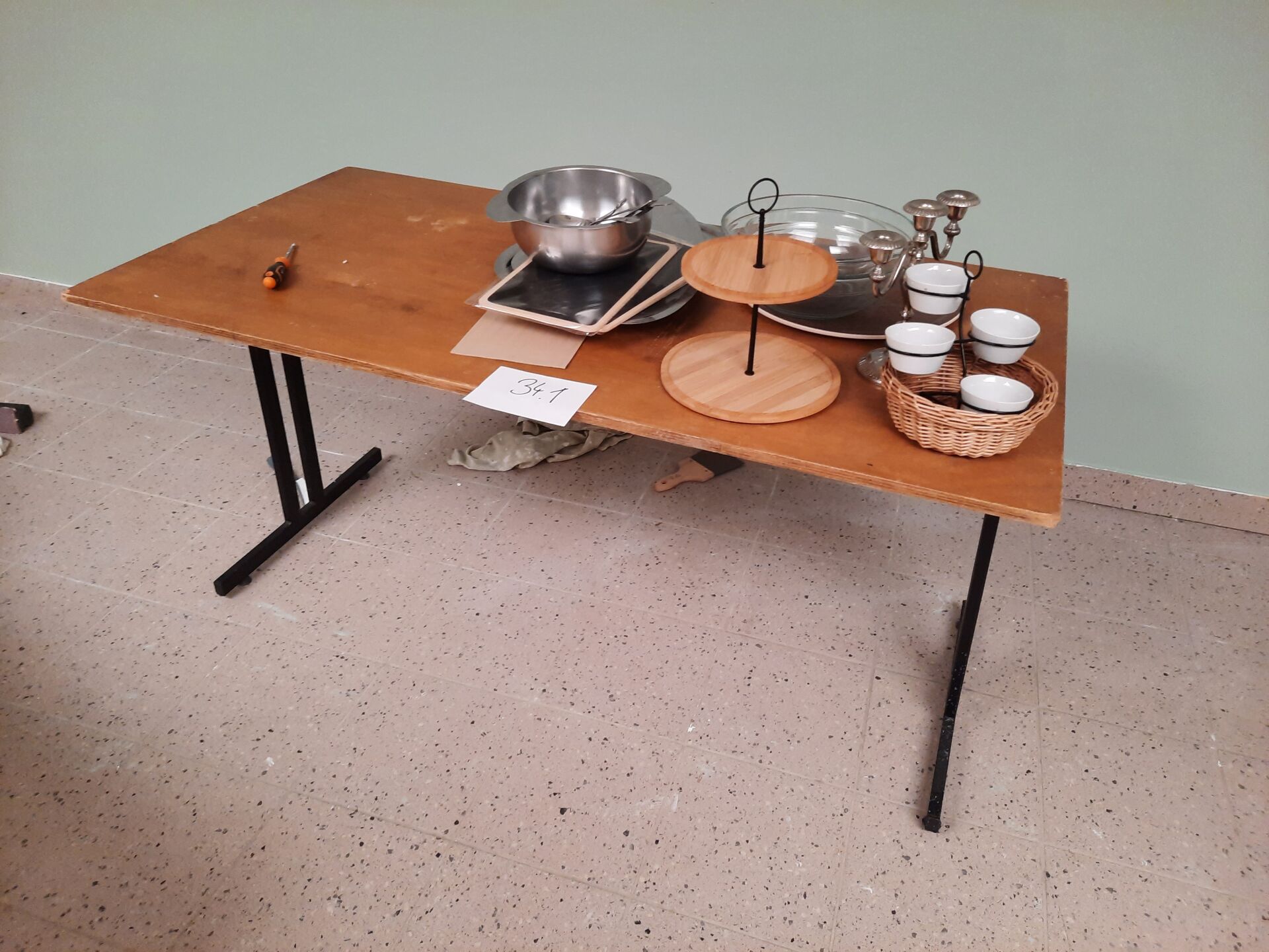 2 tables pliantes rectangulaires en métal laqué gris et pvc gris, dim. : 180 x 73cm Table ronde pliante au modèle, diam. : 150cm Mange debout en métal laqué blanc et plateau façon marbre Table pliante en métal laqué noir et bois naturel