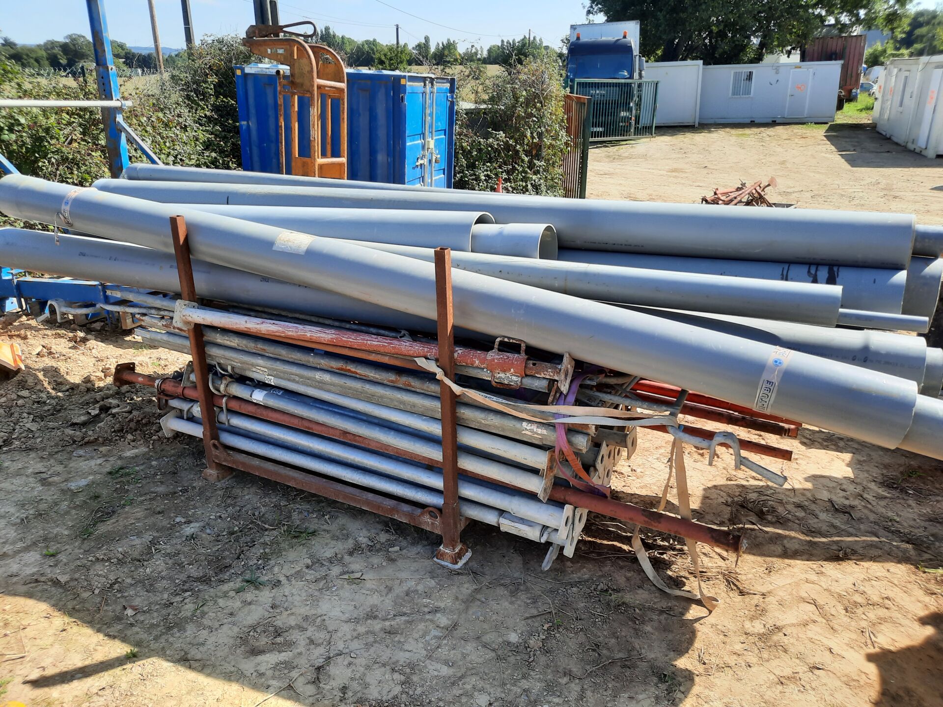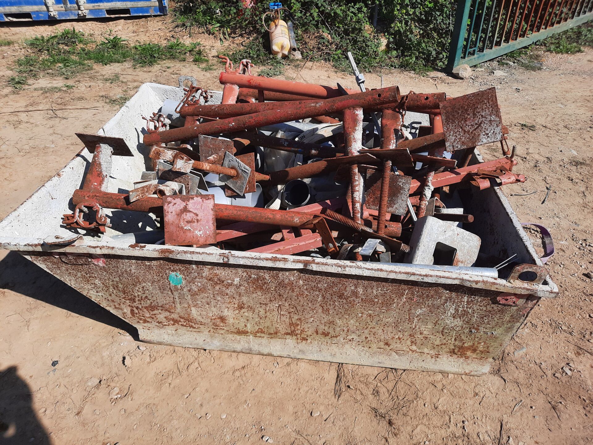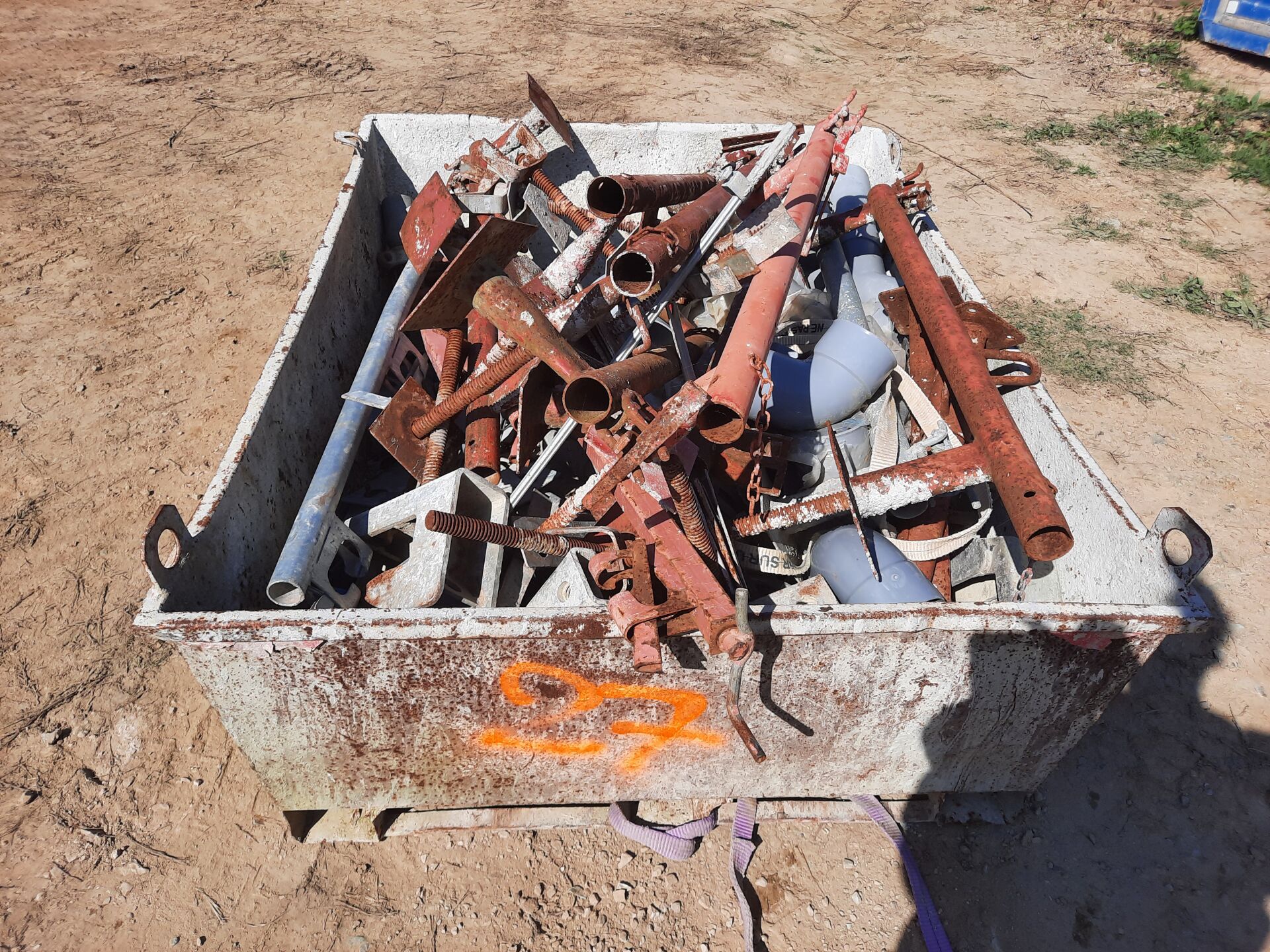 Ensemble divers composé d'environ 20 poutrelles DOKA, 44 étais renforcés en galva 15/300, éléments d'échaffaudage (5 échelles et gardes corps), éléments de garde-corps (environ 13 périphériques et 11 potelets). On joint divers tuve PVC (tailles et sections diverses), le tout réparti dans 2 paniers et une benne à prise fourche.
