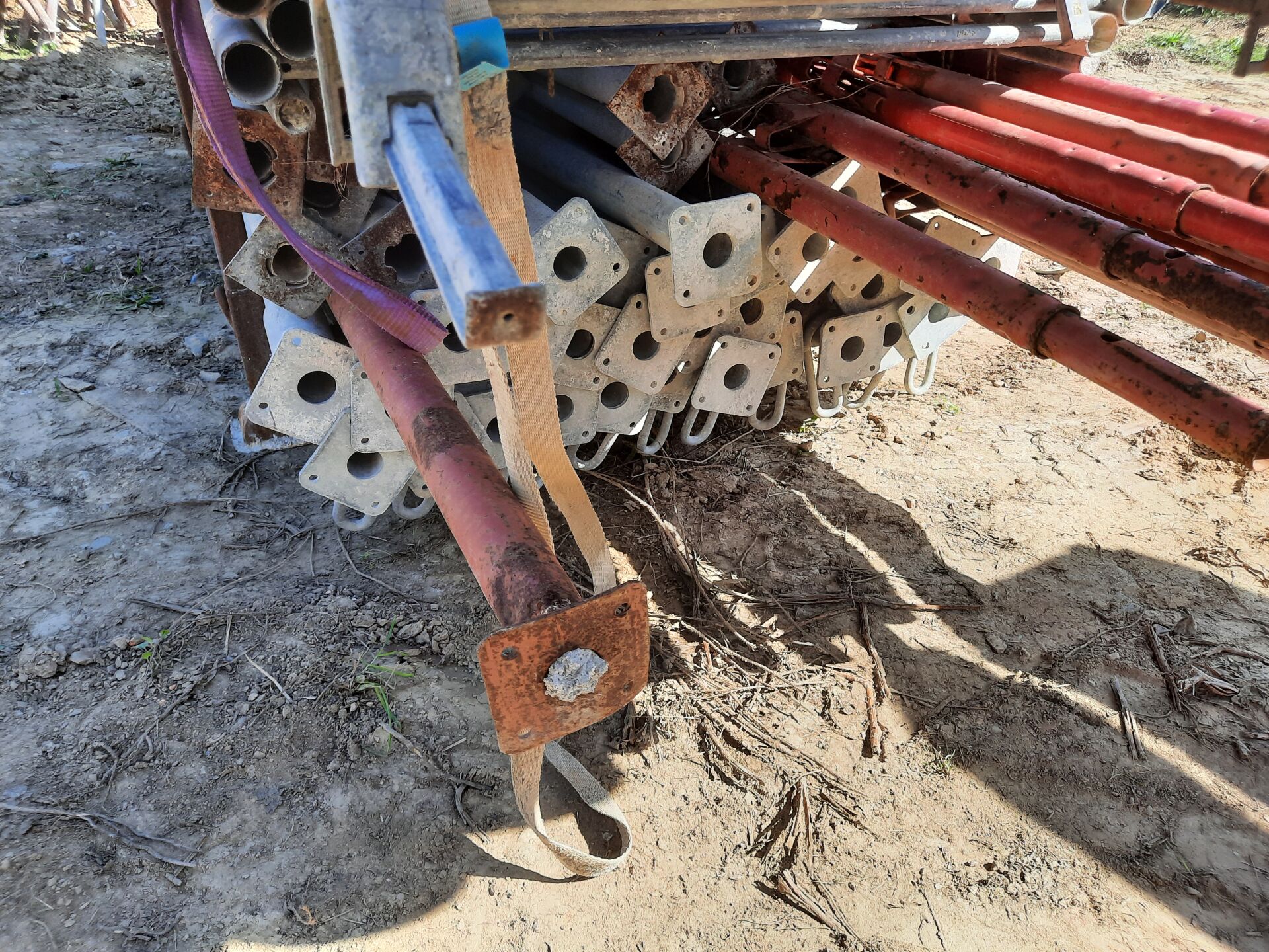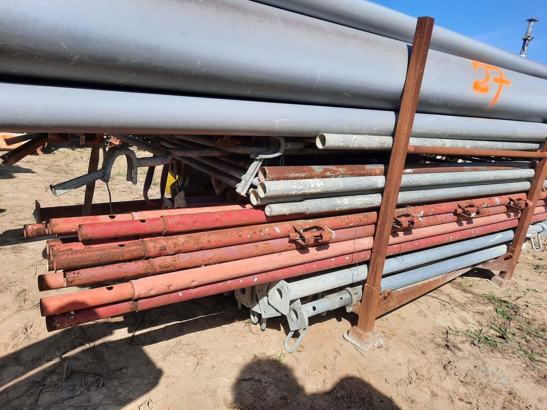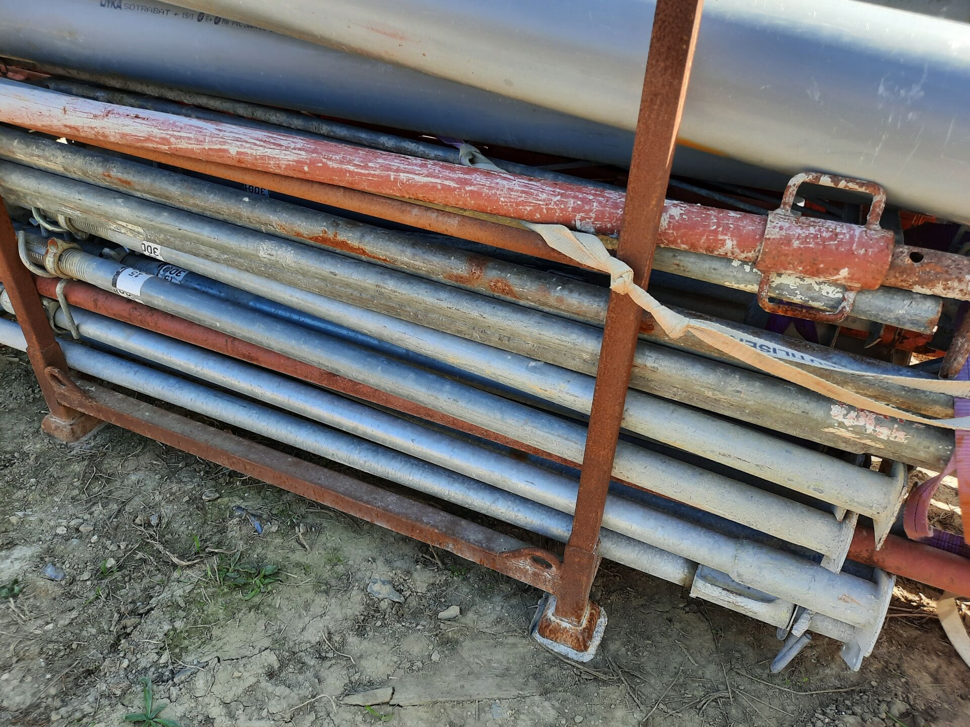 Ensemble divers composé d'environ 20 poutrelles DOKA, 44 étais renforcés en galva 15/300, éléments d'échaffaudage (5 échelles et gardes corps), éléments de garde-corps (environ 13 périphériques et 11 potelets). On joint divers tuve PVC (tailles et sections diverses), le tout réparti dans 2 paniers et une benne à prise fourche.