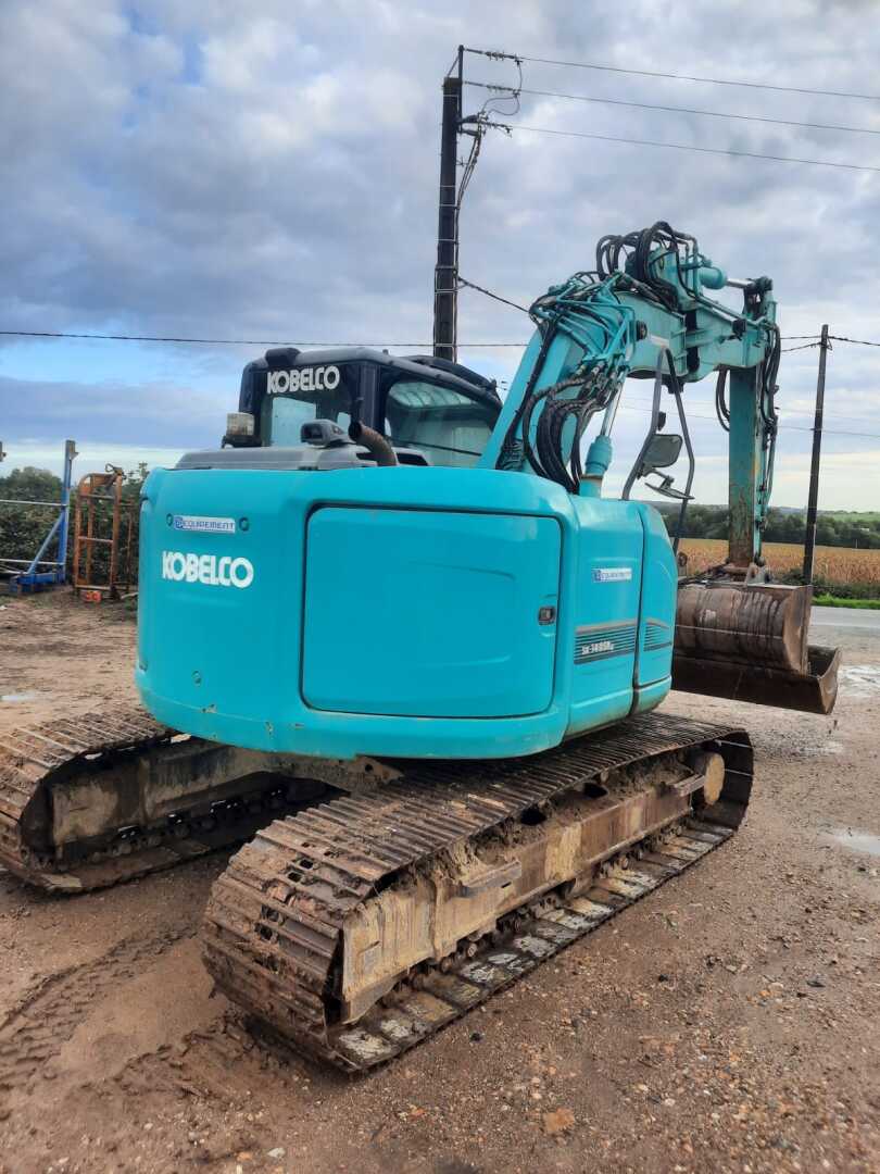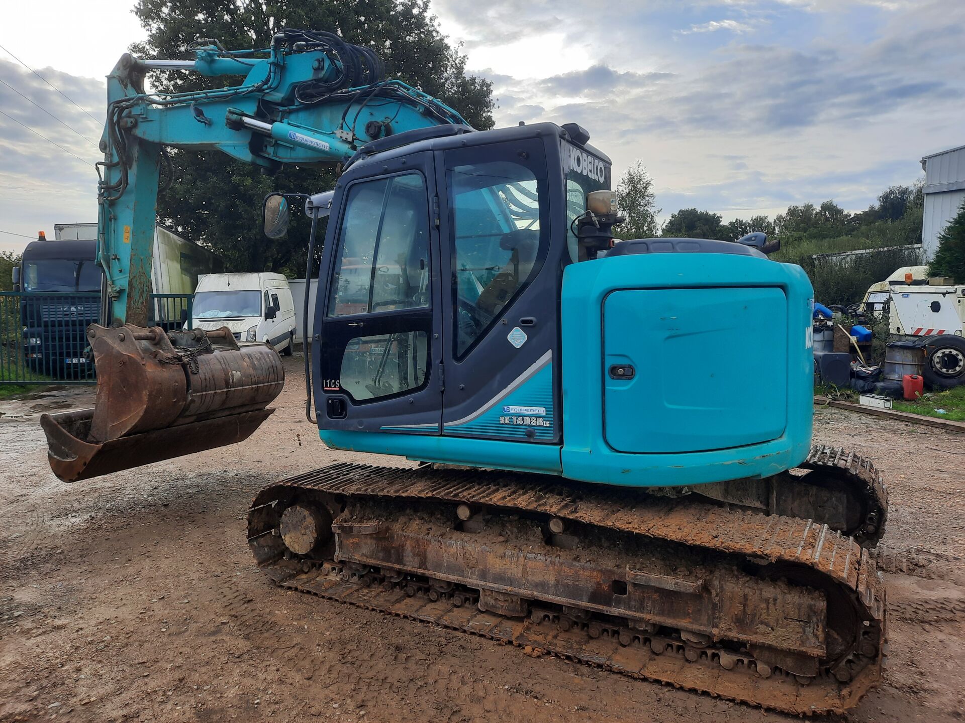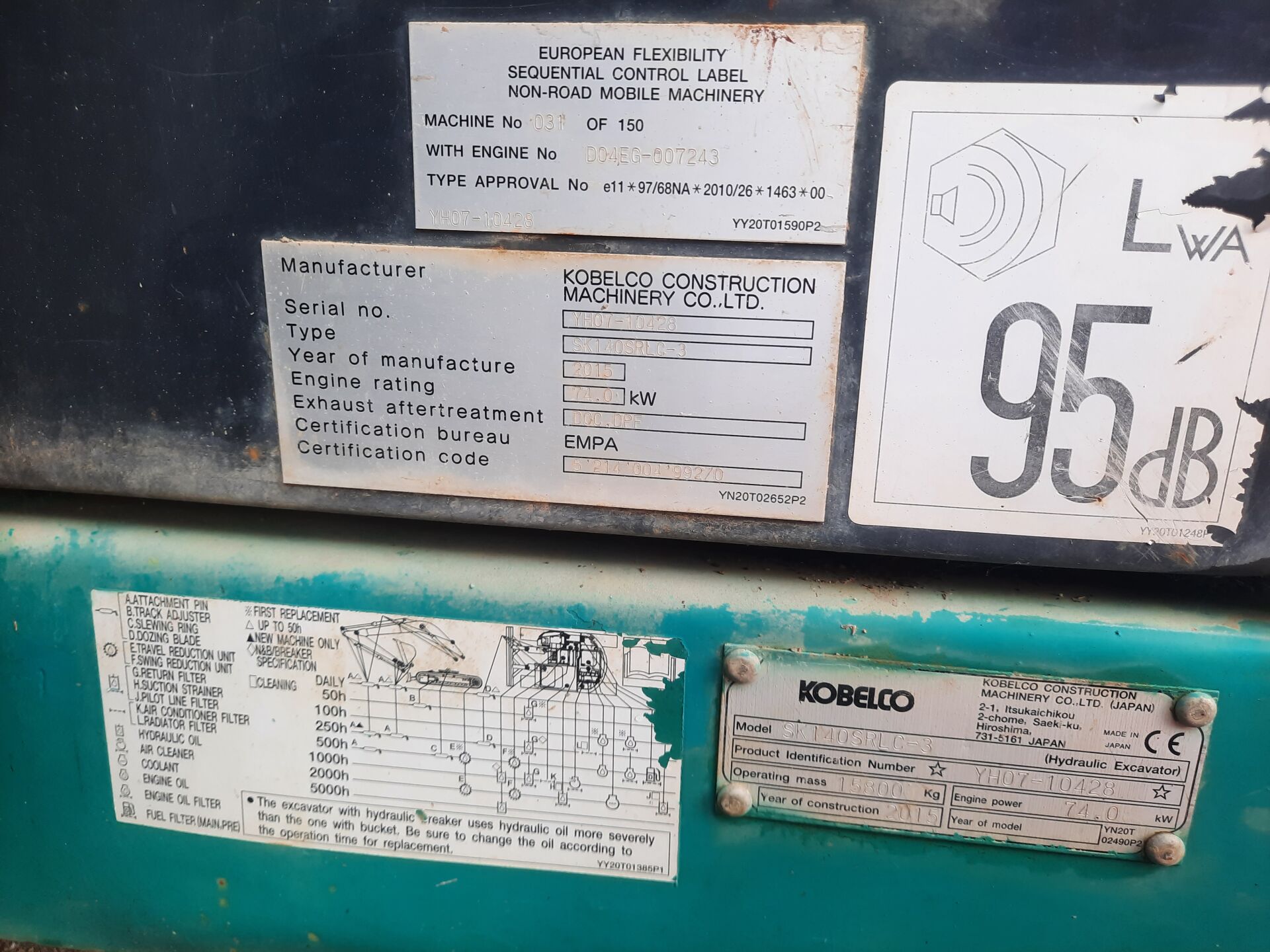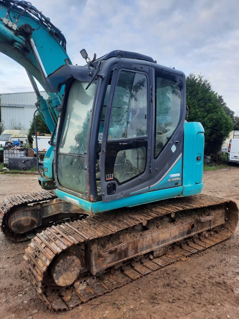 Pelle mécanique sur chenilles KOBELCO SK 140 SRLC-3, TP EQUIPEMENT, poids 14 T, de 2015 (2016) mode dégradé, problème de vanne EGR et/ou FAP Flèche à volet variable, attache automatique GEITH NS : YH 07-10428 - Code certification : 521400499270 Compteur : 5 769.8 heures Avec : 3 godets GEITH l'un 450, l'autre 1200 et curage 1800 Film sur demande