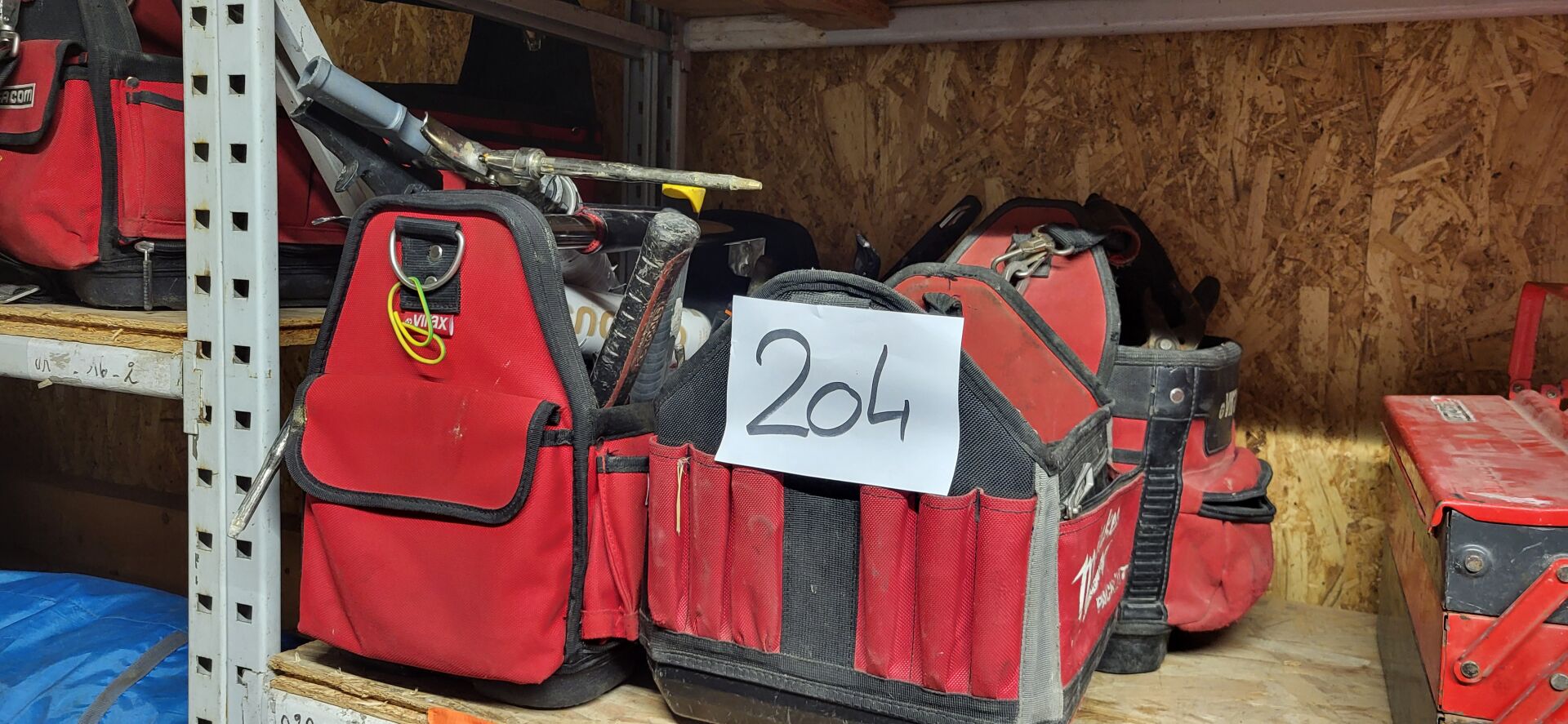 3 sacoches à outils MILWAUKEE et VIRAX garnies de pistolets à mousse, à colle, outillage à main (marteaux, pinces, tournevis, clefs...)