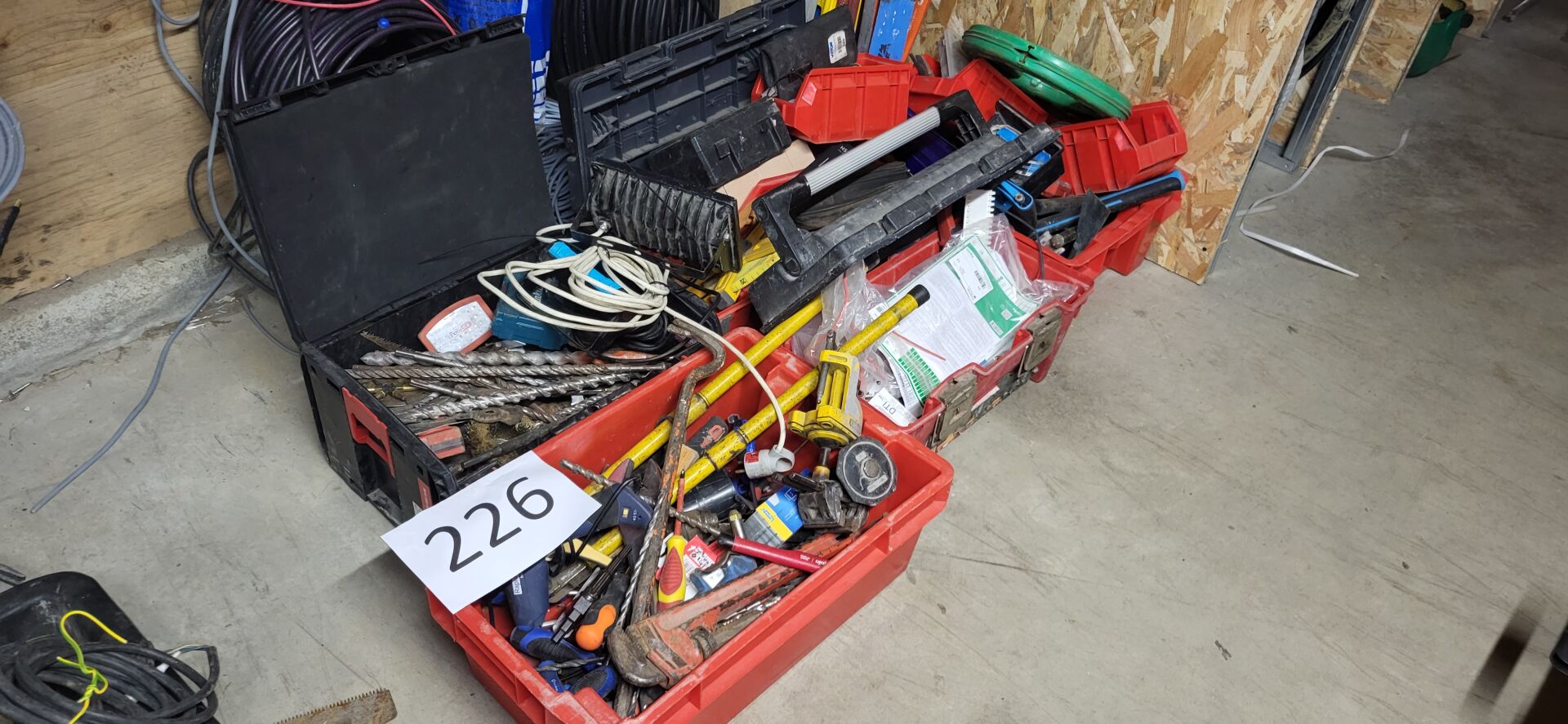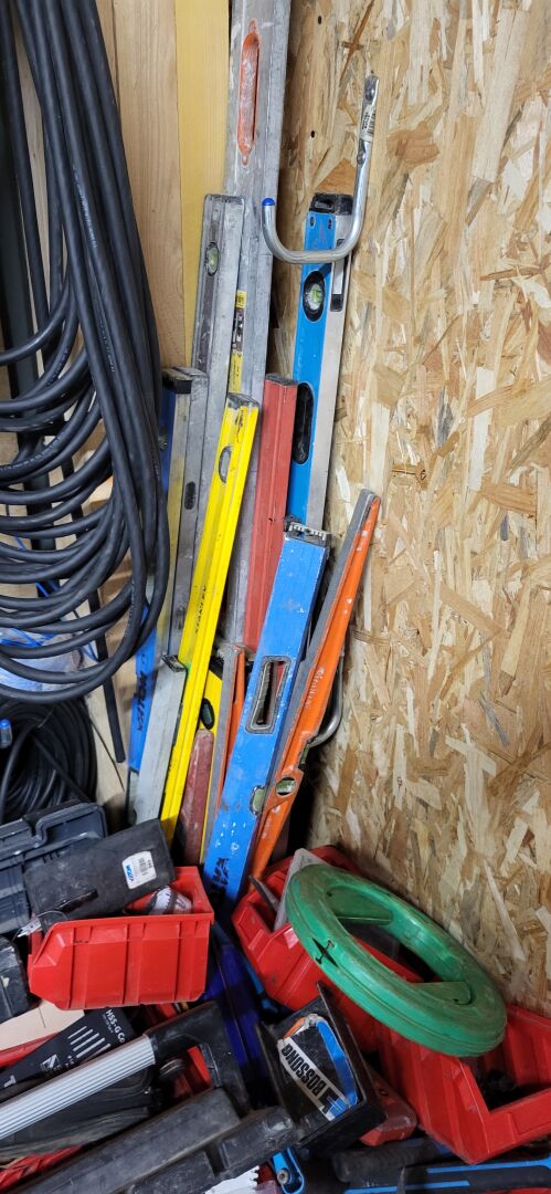 Ensemble de caisses, caisses à outils et boite de rangements, garnies d'outillage à main (tournevis, clefs, marteaux, pinces...) forêts béton, coffrets d'embouts, scies cloches, projecteur, serre joint... environ 14 niveaux et règles de maçon