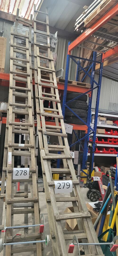 4 échelles de toit plates RICHOME, en bois naturel, environ 2 à 5 m On joint : Crochet de faitière en métal