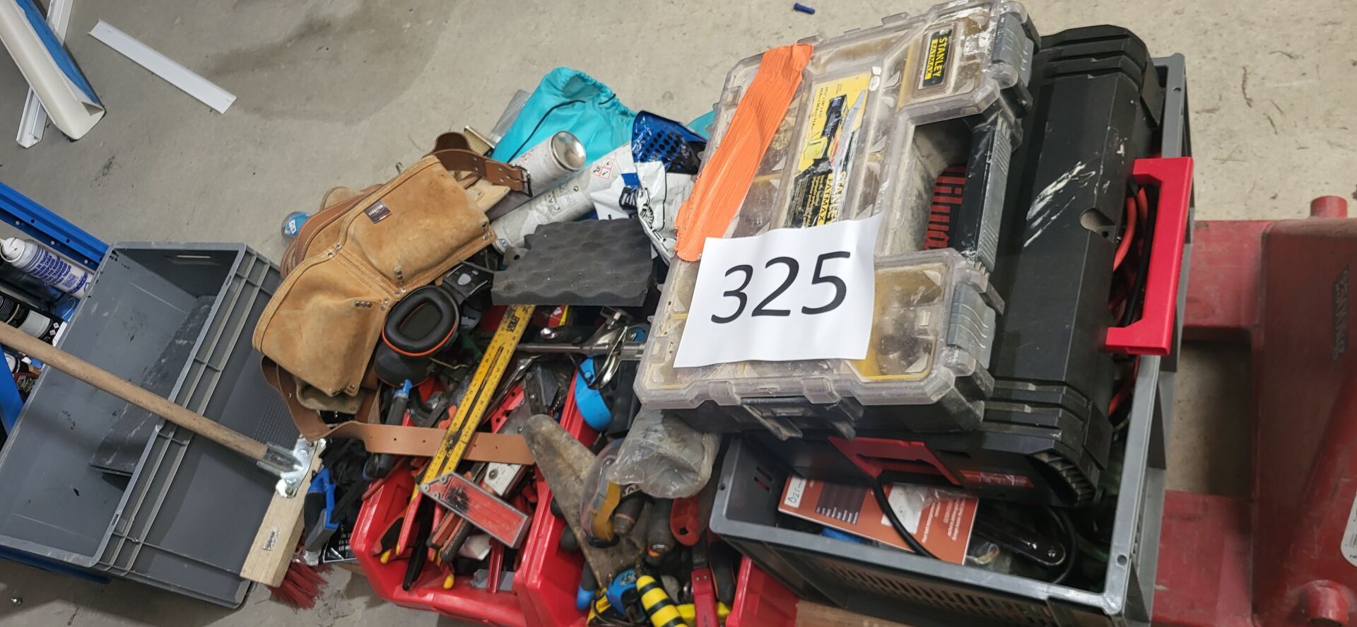 Dans une caisse en PVC gris, lot de sangles et de câbles de démarrage Lot d'outillage comprenant pinces, clés, marteau, tournevis, caque anti-bruit 4 sacoches porte-outil en cuir 1 tapis isolant, 2 casques pour travaux électriques, 2 paires de gants isolants Dans 2 caisses en PVC rouge, fort lot d'outils à main dont tournevis isolés, pinces iseolées, tenailles, pinces multiprises, équerre, pinces à sertir, scie à métaux, truelles, casque anti bruit, gant