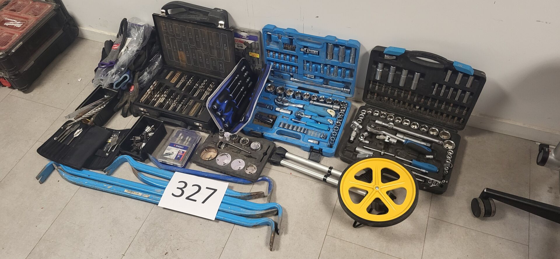 Lot d'outillage comprenant : Coffret de tournevis à tête hexagonale ATOM Coffret à douilles ATOM Coffret de forets à métaux Odomètre IRONSIDE Coffret de forets à métaux Coffret à douilles STILKER Lot comprenant forets, scies cloches, mèches à bois, coffret de clé à poignée en T, coffret de taraudage 5 pieds de biche Lots de gants