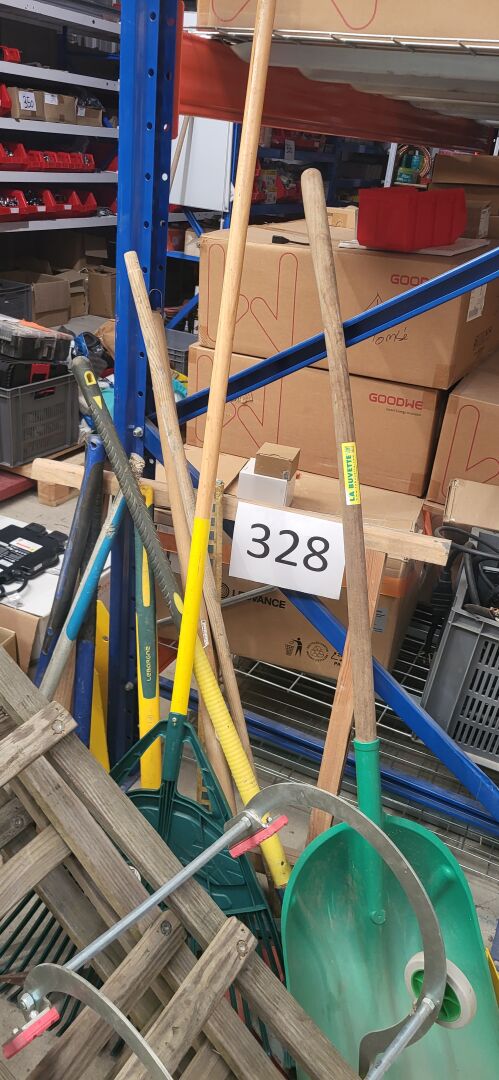 Lot d'outils à main comprenant masses, pelles, pioche, râteau, tréteau bois