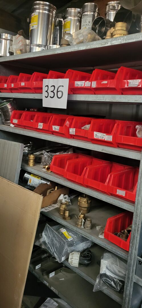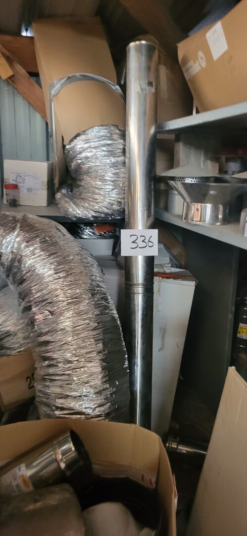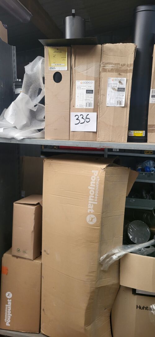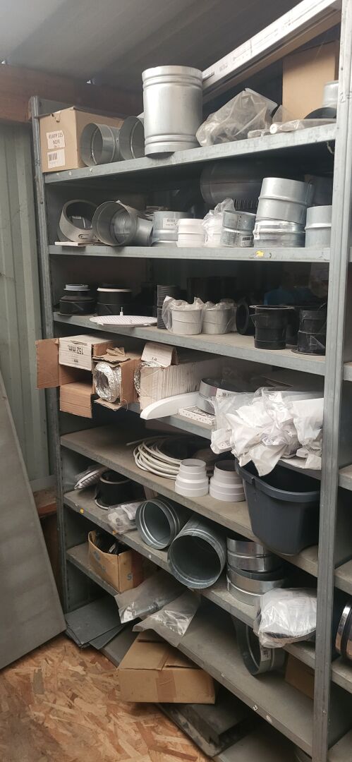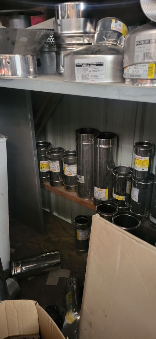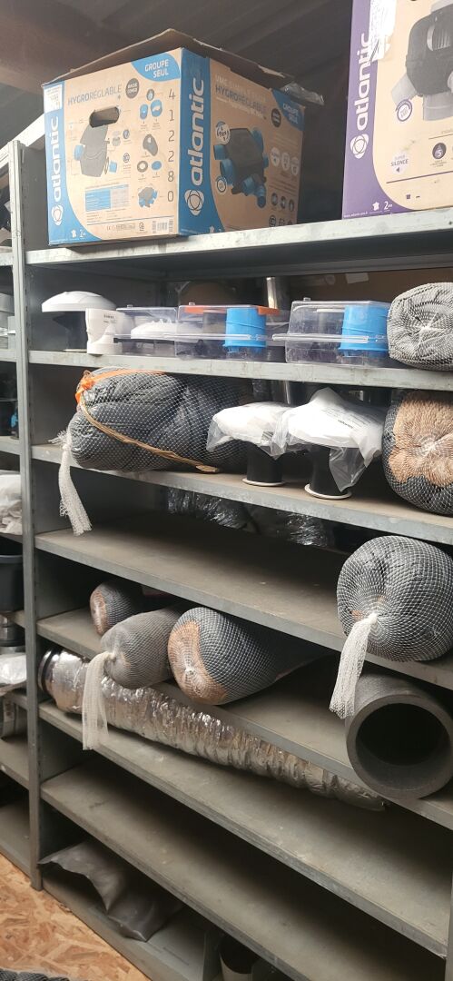 stock de fumisterie composé d'éléments de conduits de fumées dont Poujoulat et Sodico (tubes, coudes, raccords,…). Stock d'éléments de ventilation, dont VMC Atlantic, gaines isolées, conduits & raccords, bouches d'aération. On joint divers raccords laiton, et résistances chauffe eau.