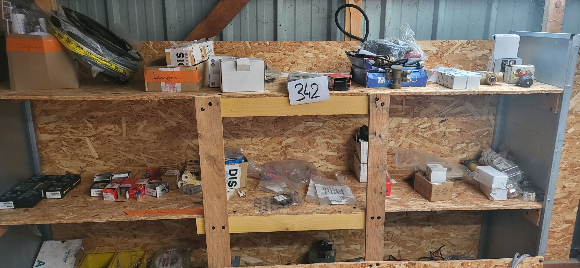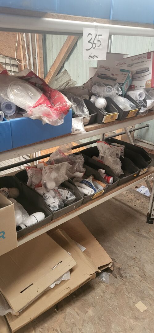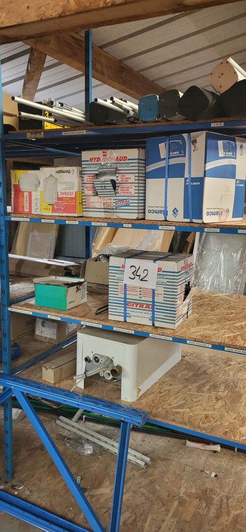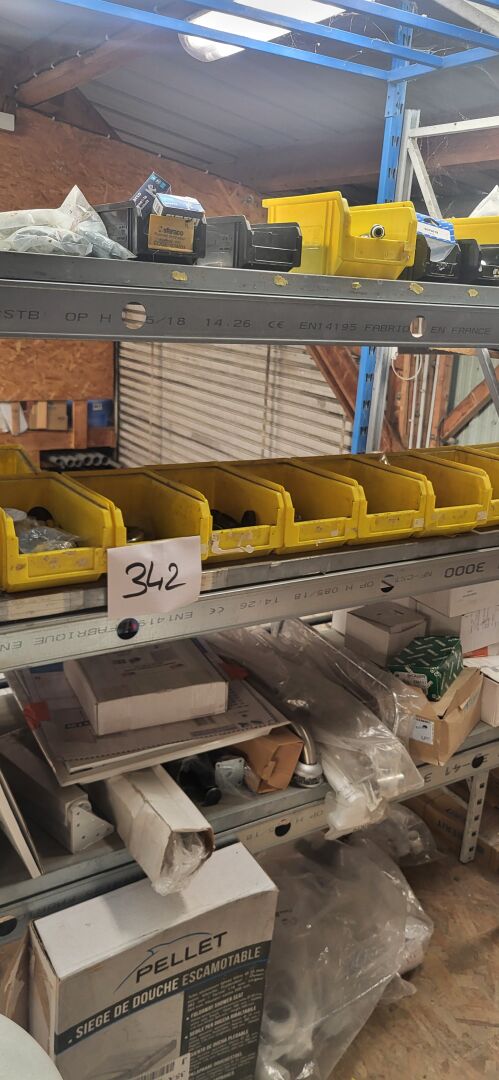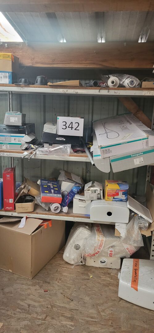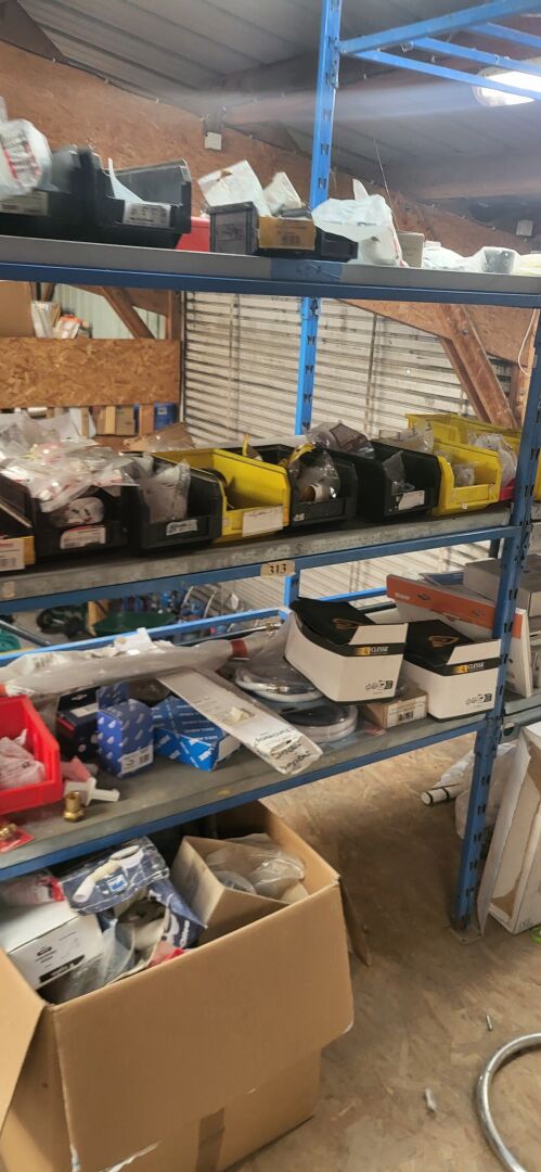 Stock d'éléments de plomberie dont robinets, mitigeurs, colonnes de douche, vases d'expansion, bondes, siphons, robinets flotteurs, et divers