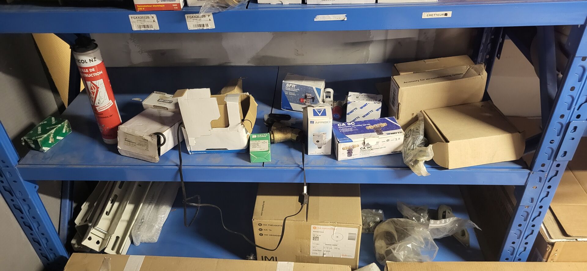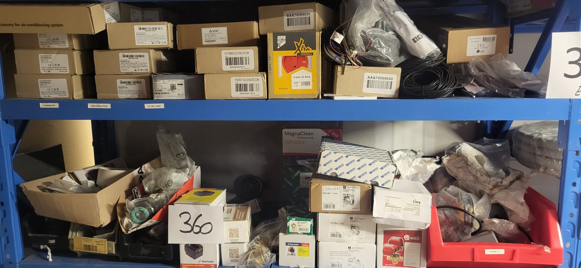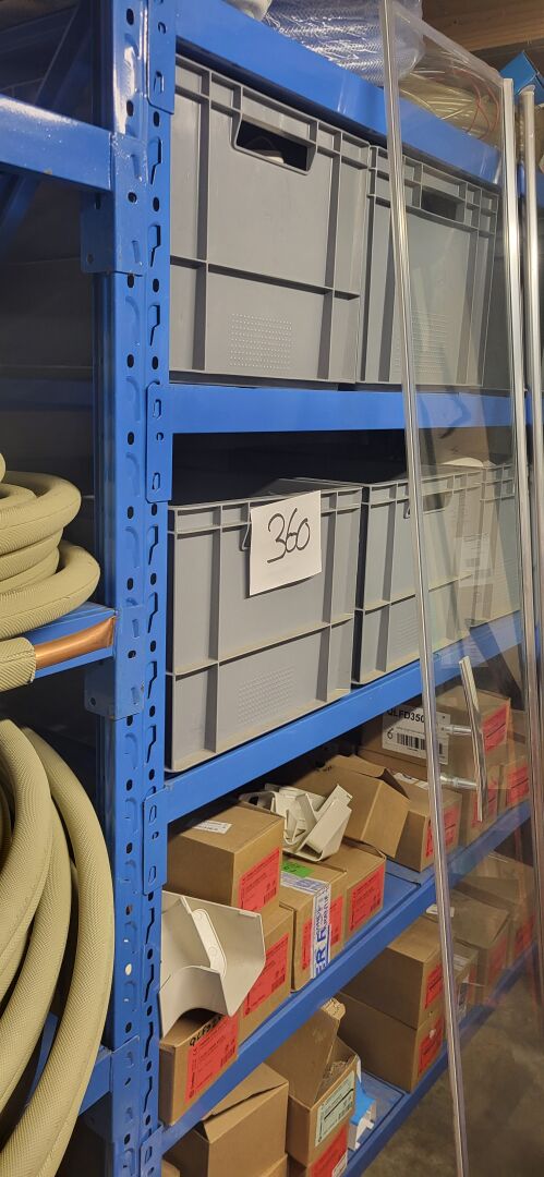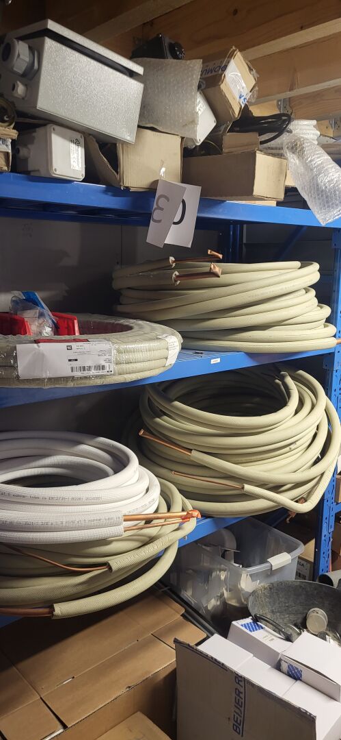 Stock d'éléments pour pompe à chaleur comprenant liaisons frigorifiques, éléments de goulottes, résistances extérieures, sectionneurs Climatisation (14) accessoires PAC. On joint 2 éléments décalarés HS dont PAC intérieure et module Air conditionné LG