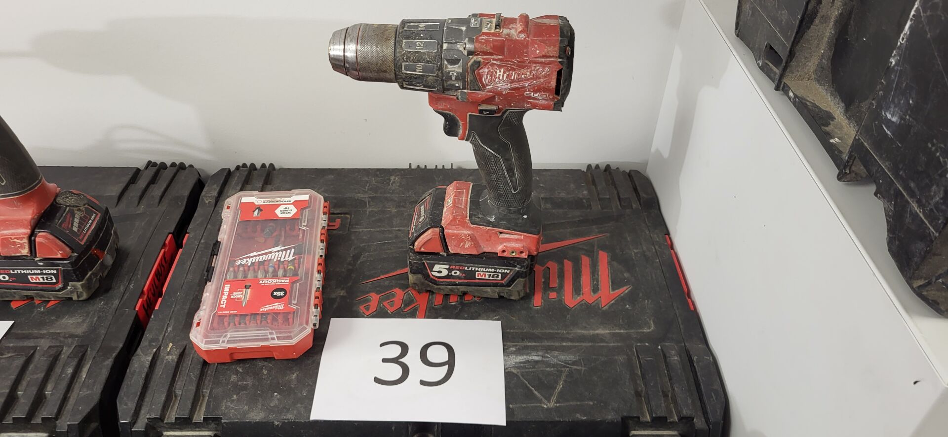 Visseuse MILWAUKEE autonome (18V), étiquette d'identification illisible, batterie 5 Ah, sans chargeur, coffret On joint : Boite d'embouts MILWAUKEE