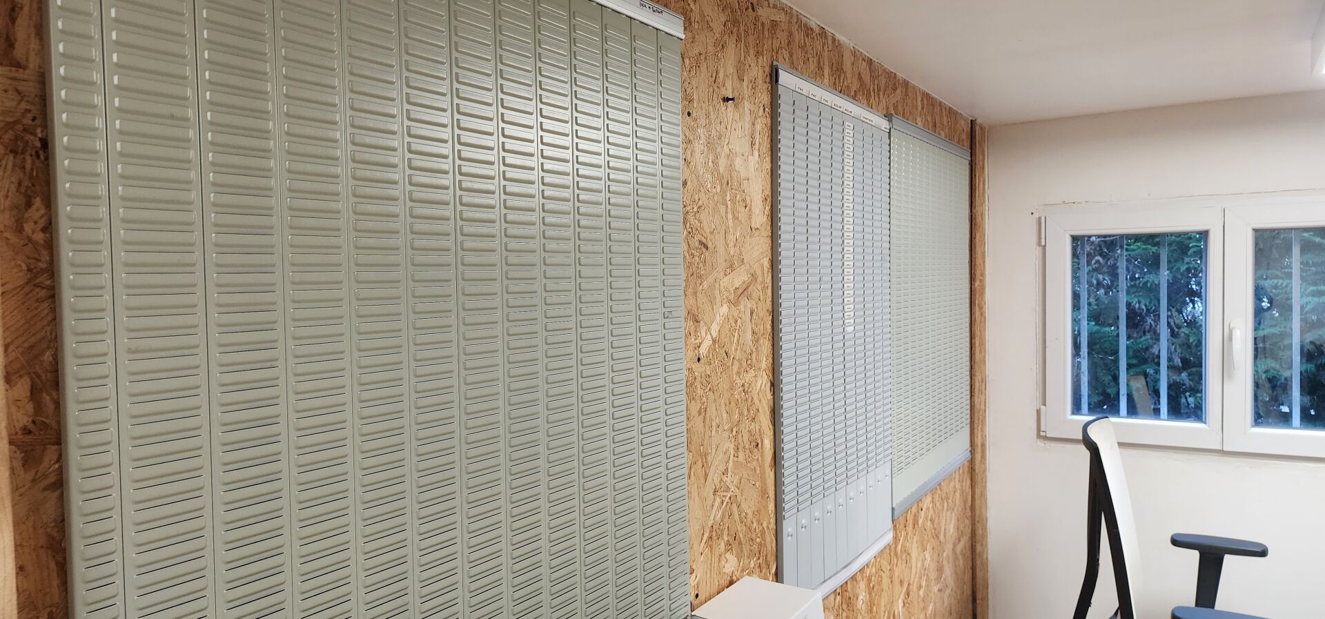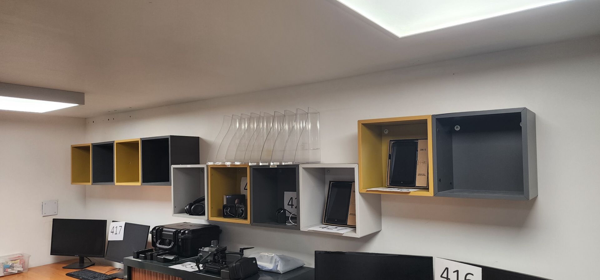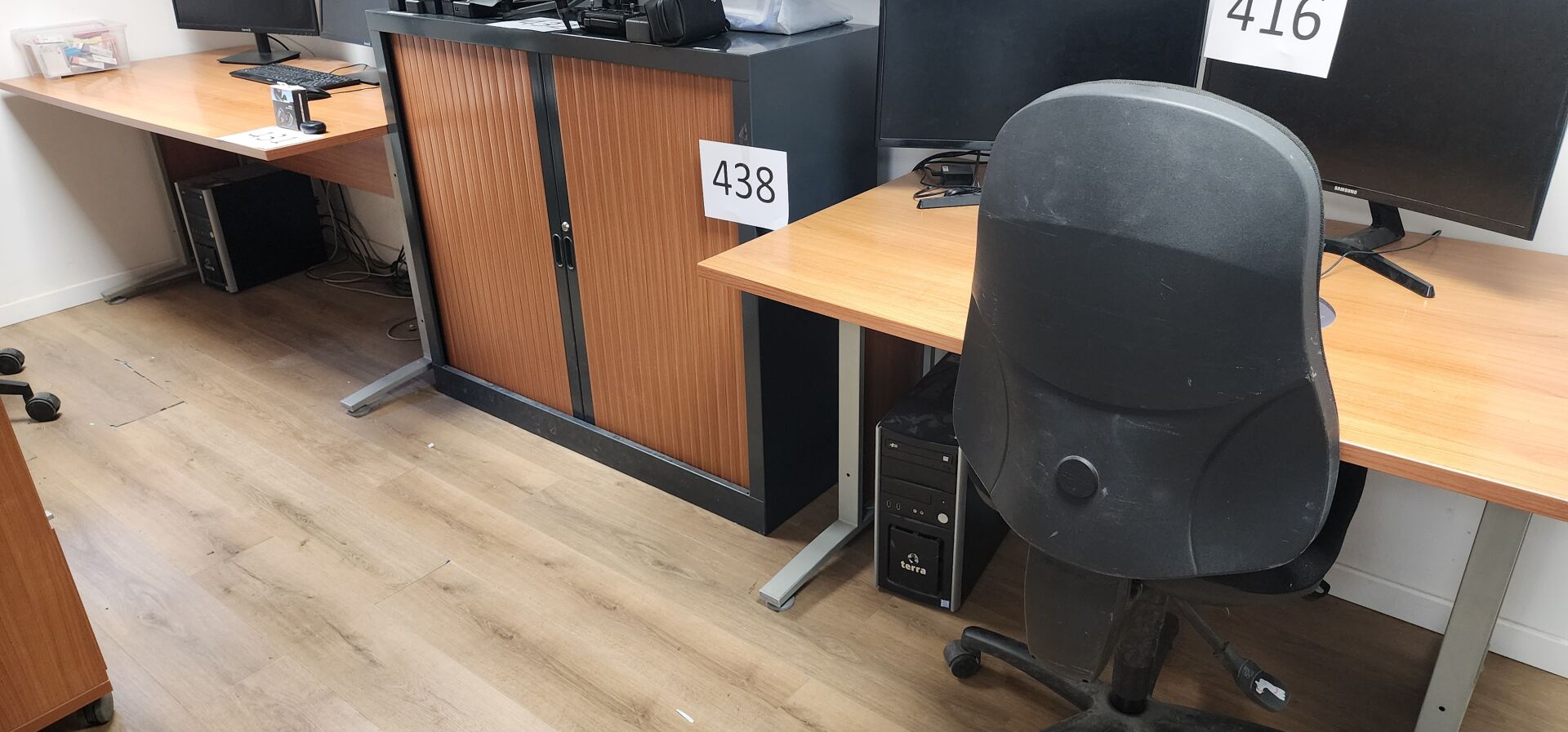 2 bureaux en mélaminé façon bois et gris 120x80 cm, l'un avec caisson ouvrant à 3 tiroirs Chaise dactylo, assise en tissu noir Fauteuil dactylo, assise en simili cuir blanc Armoire basse à rideaux en métal laqué gris 120x42x102 cm 10 étagères murales en médium laqué gris et jaune 4 plannings métalliques