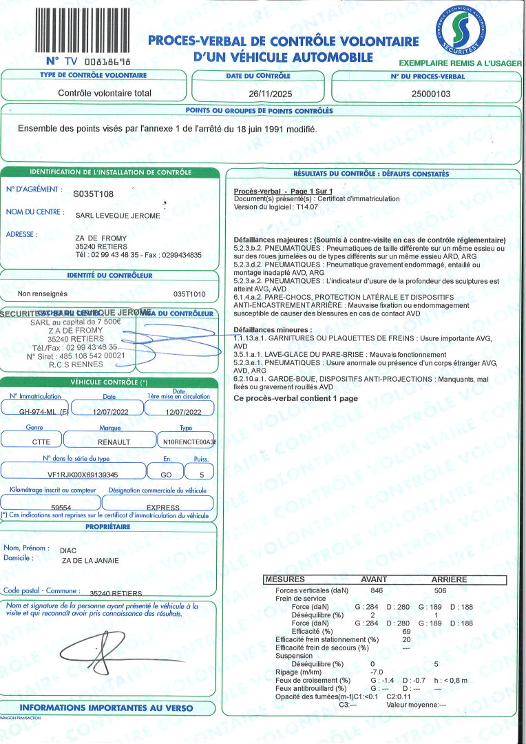 VENDU SUR DESIGNATION - VISIBLE A L'ETUDE DE NANTES - A ENLEVER AVANT LE 22 12 2025 BVM6- CLIM- RADIO- VITRES ET RETROS ELCT- REGULATEUR DE VITESSES- CAISSE BOIS- PUB ADH. SIEGES EN TISSU TACHES- 1 TROU SUR LE SIEGE PASSAGER- PLASTIQUES RAYES ET TACHES. PARE CHOCS AV DEBOITE- RAYURES D'USAGE. DEFAILLANCES MAJEURES: PNEUS DIFFERENTS SUR UN MEME ESSIEU ARD ET ARG- PNEU AVD ET ARG GRAVEMENT ENDOMMAGES- PARE CHOCS AVD DEBOITE. DEFAILLANCES MINEURES: USURE IMPORTANTE DES GARNITURES OU PLAQUETTES DE FREINS AVG ET AVD- MAUVAIS FONCTIONNEMENT DU LAVE GLACE- USURE ANORMALE DES PNEUS AVG, AVD ET ARG. frais volontaires 18 % ht