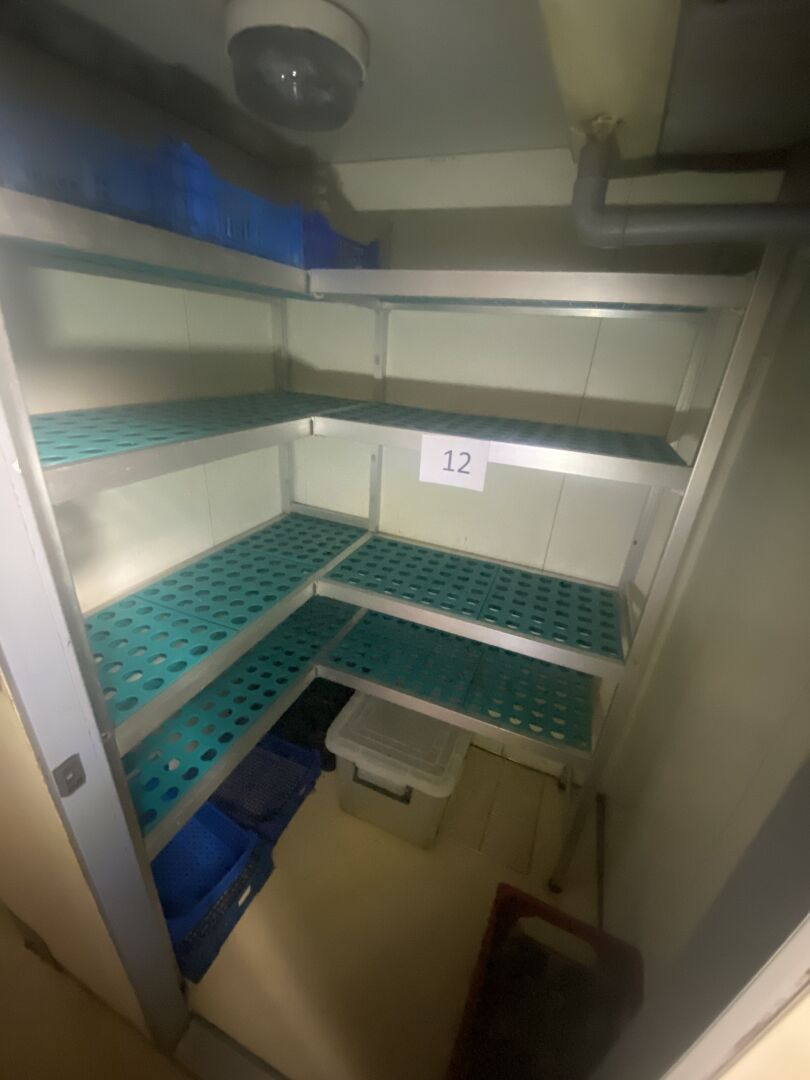 1 rayonnage d'angle alimentaire en aluminium à clayettes plastiques amovibles, en angle. 4 étages. 104 x 122 x 176 cm