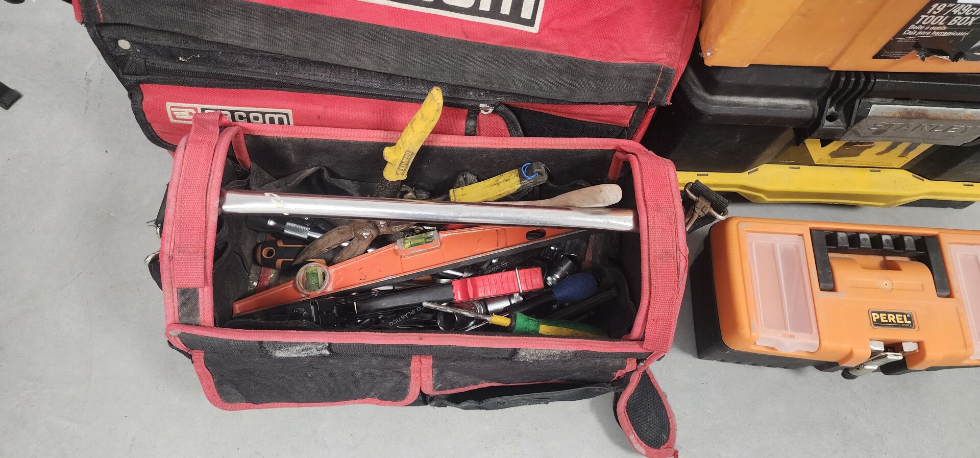 1 sacoche avec outils dont clés, pinces..., 1 petite caisse à outils PEREL 1 caisse à outils plastique vide, ZAG 1 sacoche à outils souple FACOM vide, 1 caisse à outils STANLEY vide