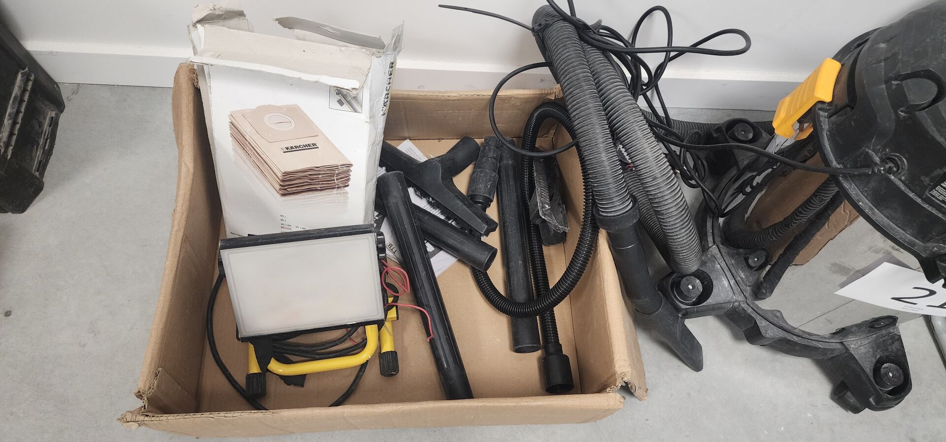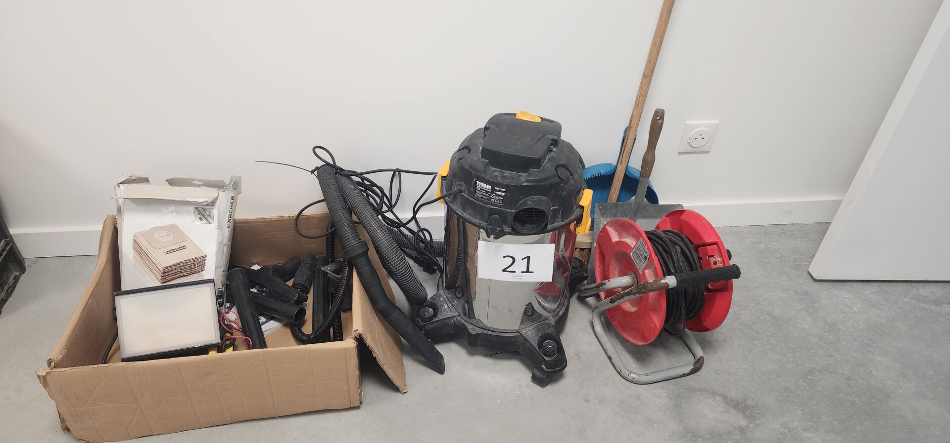 1 projecteur LED DIALL 1 rallonge électrique sur touret NEXANS 25 m , 1 planche à roulettes 1 aspirateur eau/poussière TITAN TTB775VAC avec accessoires