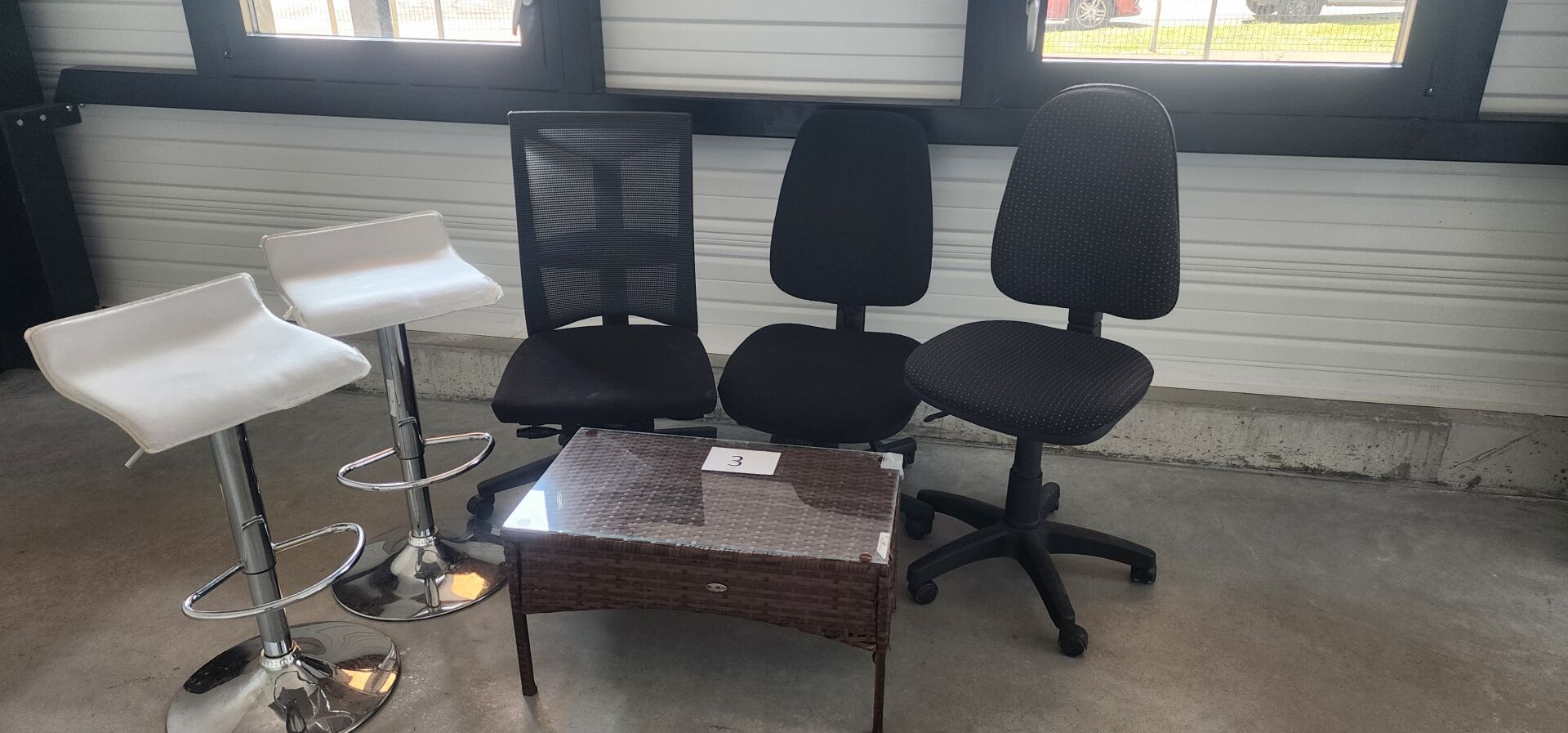3 chaises tournantes et roulantes tissu, 2 tabourets réglables en hauteur piètement chromé simili cuir blanc (état moyen), 1 table basse plateau verre