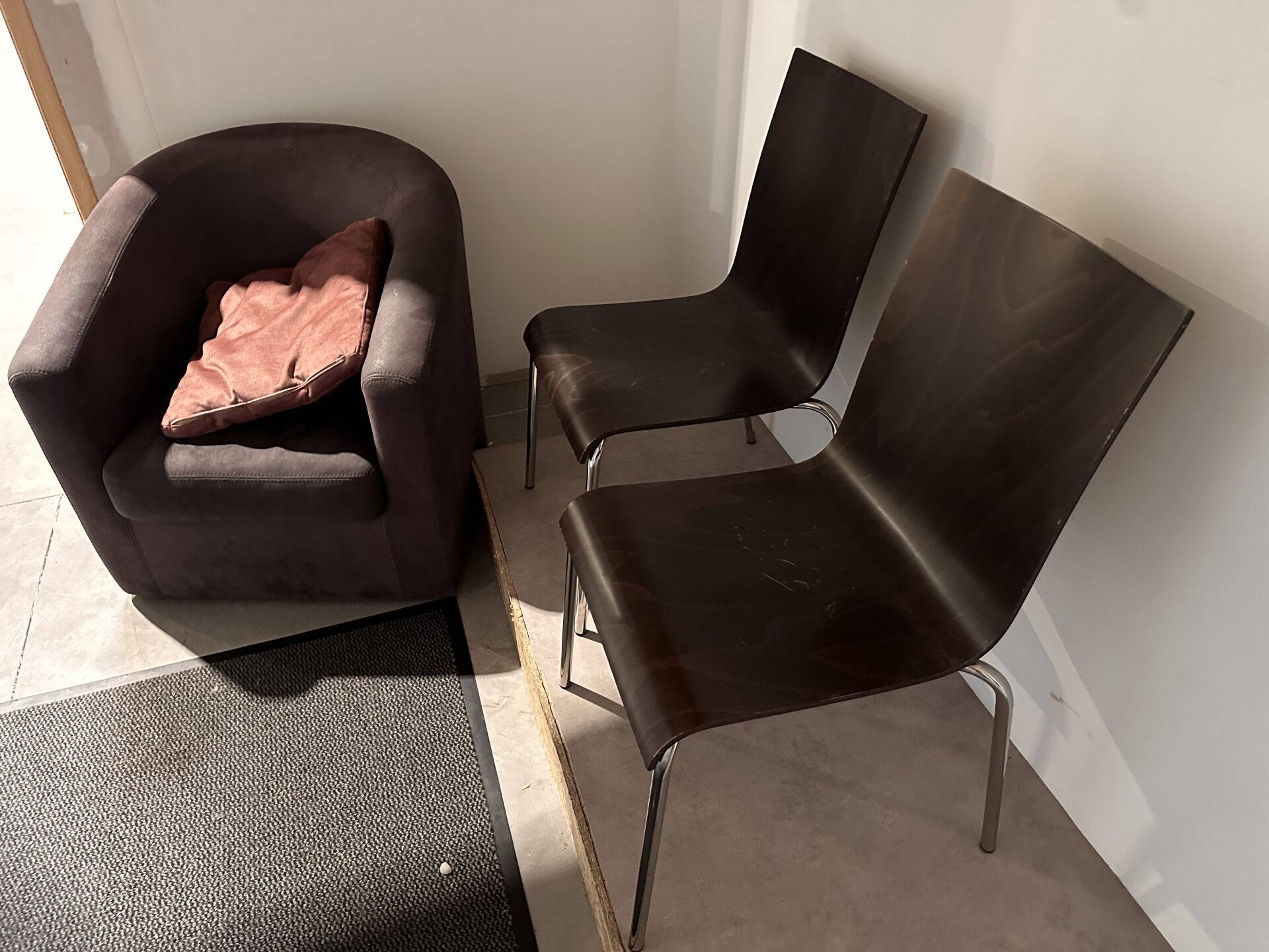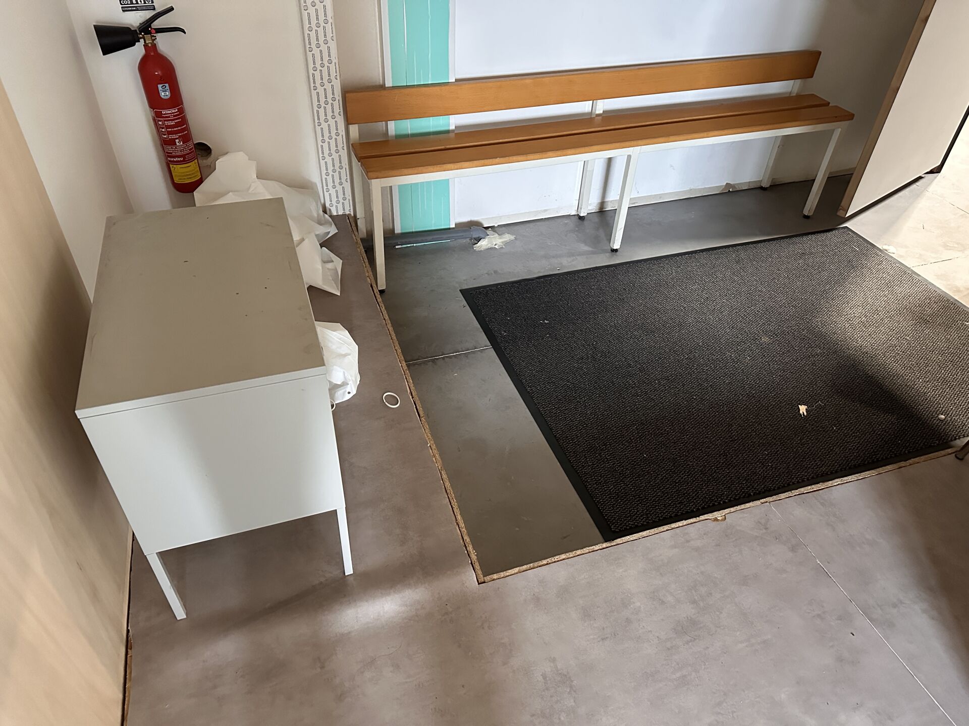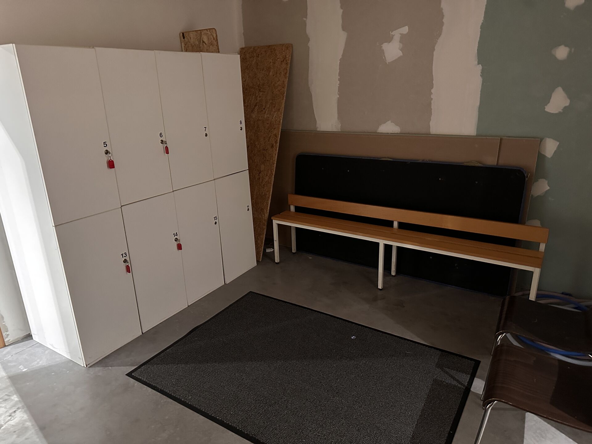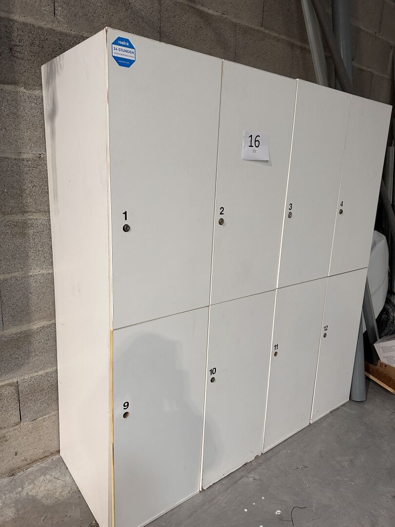 2 vestiaires de 8 casiers à clé mélaminé blanc, 160 x 60 x 184 cm 3 bancs bois/métal 2m 2 meubles bas 2 portes métal, 3 chaises mélaminé bois piétement métal chromé, 1 fauteuil tissu taupe