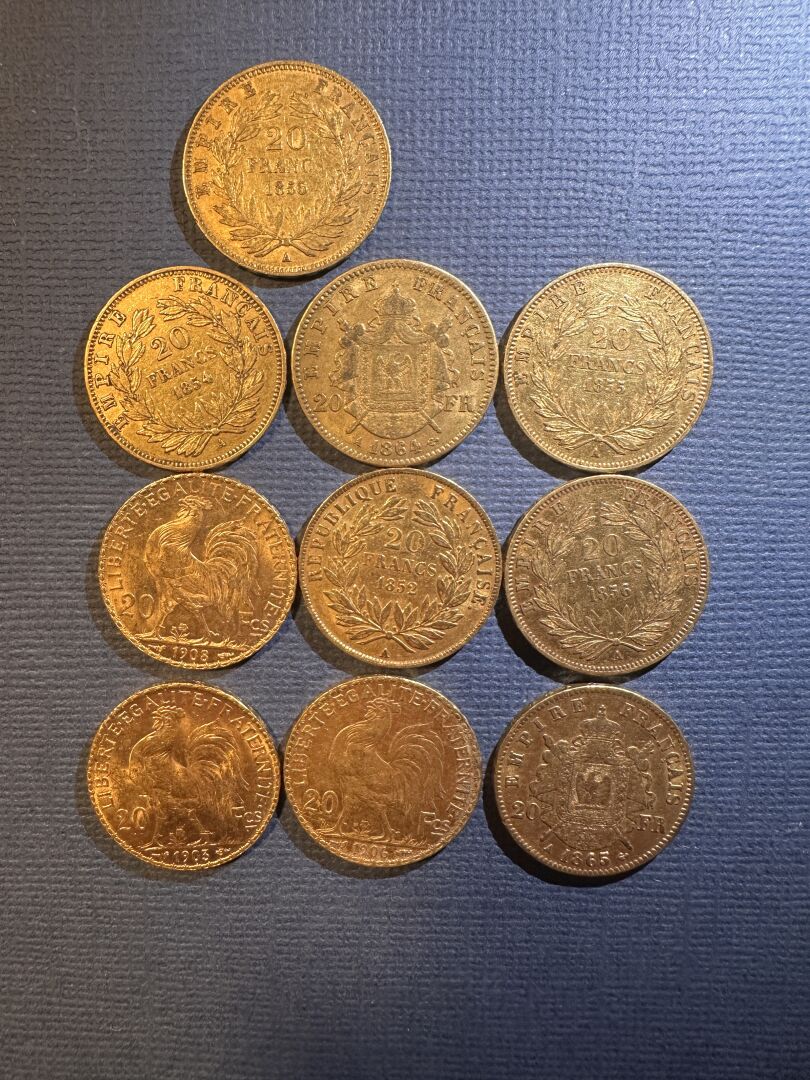 Dix pièces de 20 francs or 1856, 1854, 1864, 1855, 1908, 1903, 1852, 1906, 1856, 1865. Poids : 64.21 g PIECES CONSERVEES A LA BANQUE - VENDUES SUR DESIGNATION - VISIBLES SUR RENDEZ-VOUS UNIQUEMENT 48 H AVANT LA VENTE - DELIVRANCE SUR RENDEZ-VOUS UNIQUEMENT 72 HEURES A L'AVANCE