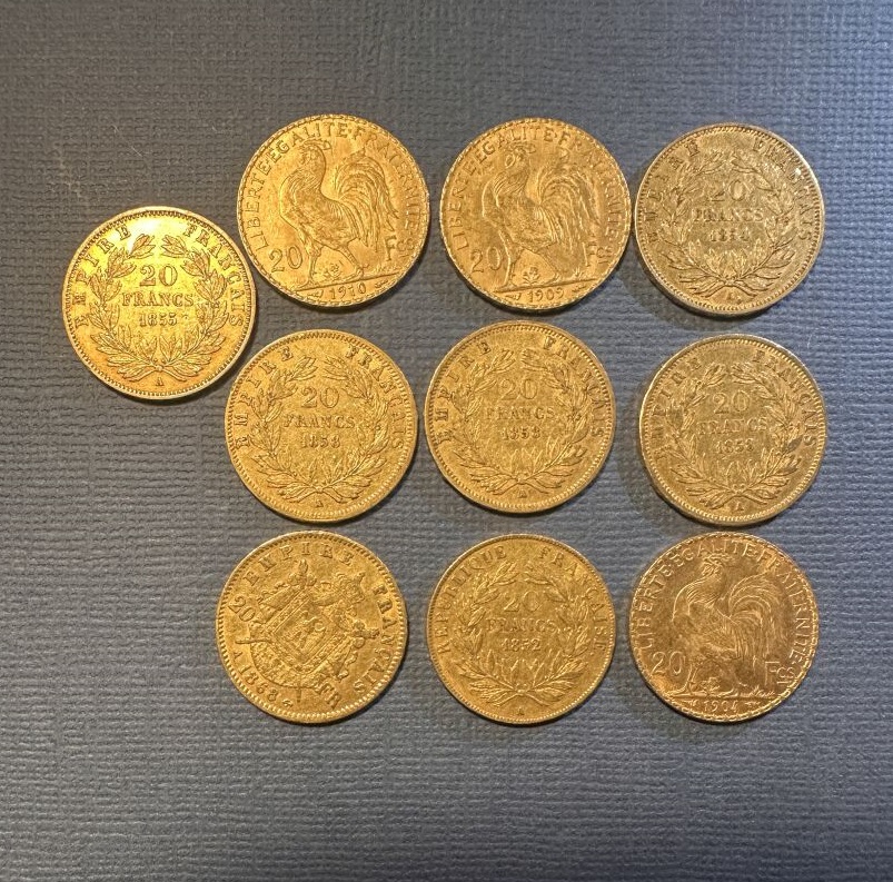 Dix pièces de 20 francs or 1855, 1910, 1909, 1854, 1858, 1858, 1858, 1868, 1852, 1904. Poids : 64.31 g PIECES CONSERVEES A LA BANQUE - VENDUES SUR DESIGNATION - VISIBLES SUR RENDEZ-VOUS UNIQUEMENT 48 H AVANT LA VENTE - DELIVRANCE SUR RENDEZ-VOUS UNIQUEMENT 72 HEURES A L'AVANCE