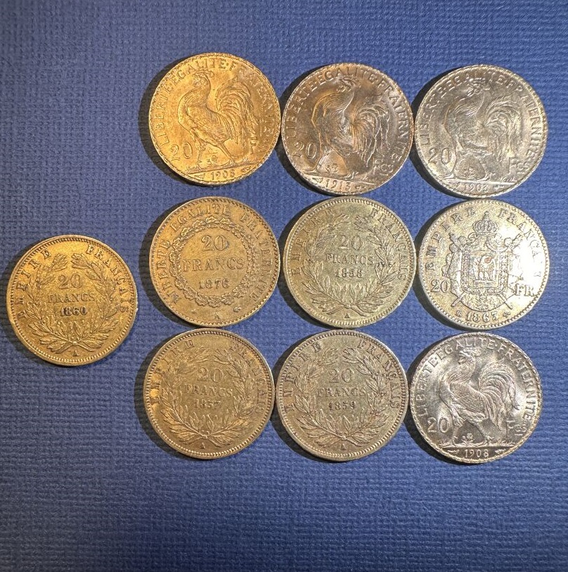 Dix pièces de 20 francs or 1860, 1908, 1876, 1857, 1913, 1903, 1858, 1863, 1859, 1908. Poids : 64.29 g PIECES CONSERVEES A LA BANQUE - VENDUES SUR DESIGNATION - VISIBLES SUR RENDEZ-VOUS UNIQUEMENT 48 H AVANT LA VENTE - DELIVRANCE SUR RENDEZ-VOUS UNIQUEMENT 72 HEURES A L'AVANCE