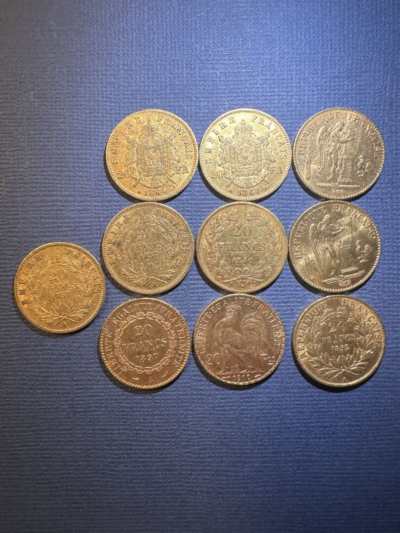 Dix pièces de 20 francs or 1852, 1857, 1868, 1875, 1910, 1895, 1864, 1857, 1840, 1897. Poids : 64.21 g PIECES CONSERVEES A LA BANQUE - VENDUES SUR DESIGNATION - VISIBLES SUR RENDEZ-VOUS UNIQUEMENT 48 H AVANT LA VENTE - DELIVRANCE SUR RENDEZ-VOUS UNIQUEMENT 72 HEURES A L'AVANCE
