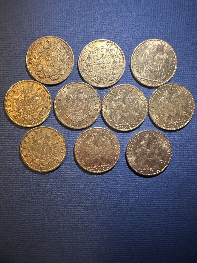 Dix pièces de 20 francs or 1863, 1852, 1865, 1853, 1865, 1910, 1912, 1906, 1913, 1908. Poids : 64.37 g PIECES CONSERVEES A LA BANQUE - VENDUES SUR DESIGNATION - VISIBLES SUR RENDEZ-VOUS UNIQUEMENT 48 H AVANT LA VENTE - DELIVRANCE SUR RENDEZ-VOUS UNIQUEMENT 72 HEURES A L'AVANCE