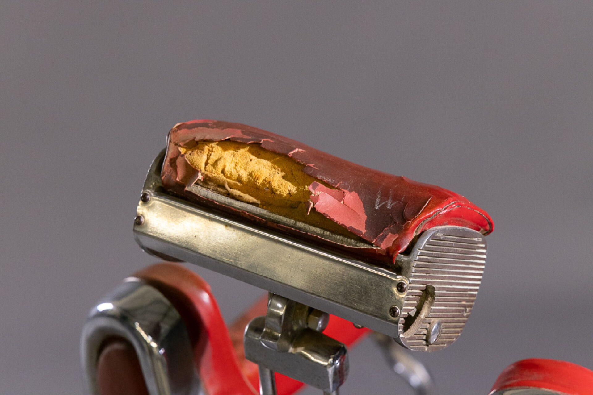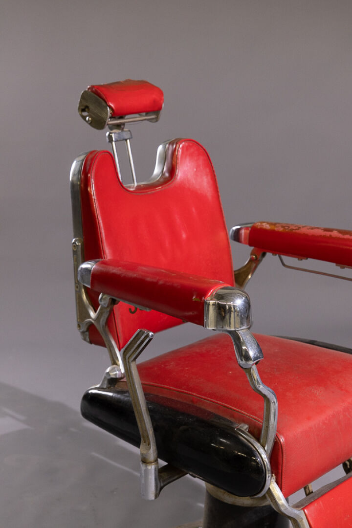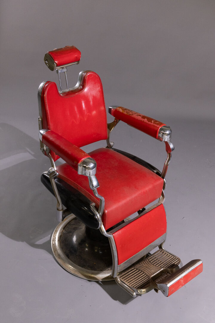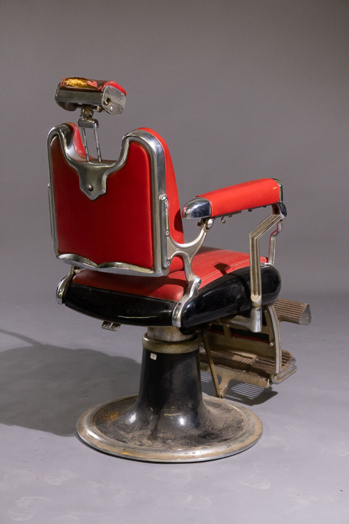 Maison FIGARO à Paris. Fauteuil de barbier en similicuir rouge et métal chromé ou laqué noir à repose-pieds (accidents, manques, système grippé). Vers 1950. Haut. : 112 cm - Larg. : 68 cm - Prof. : 90 cm