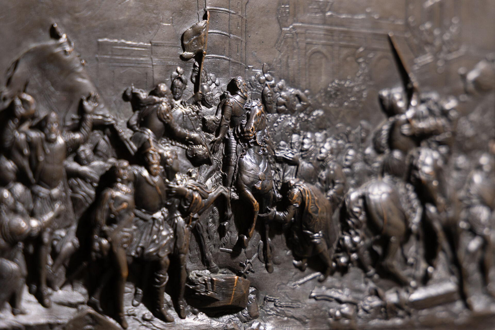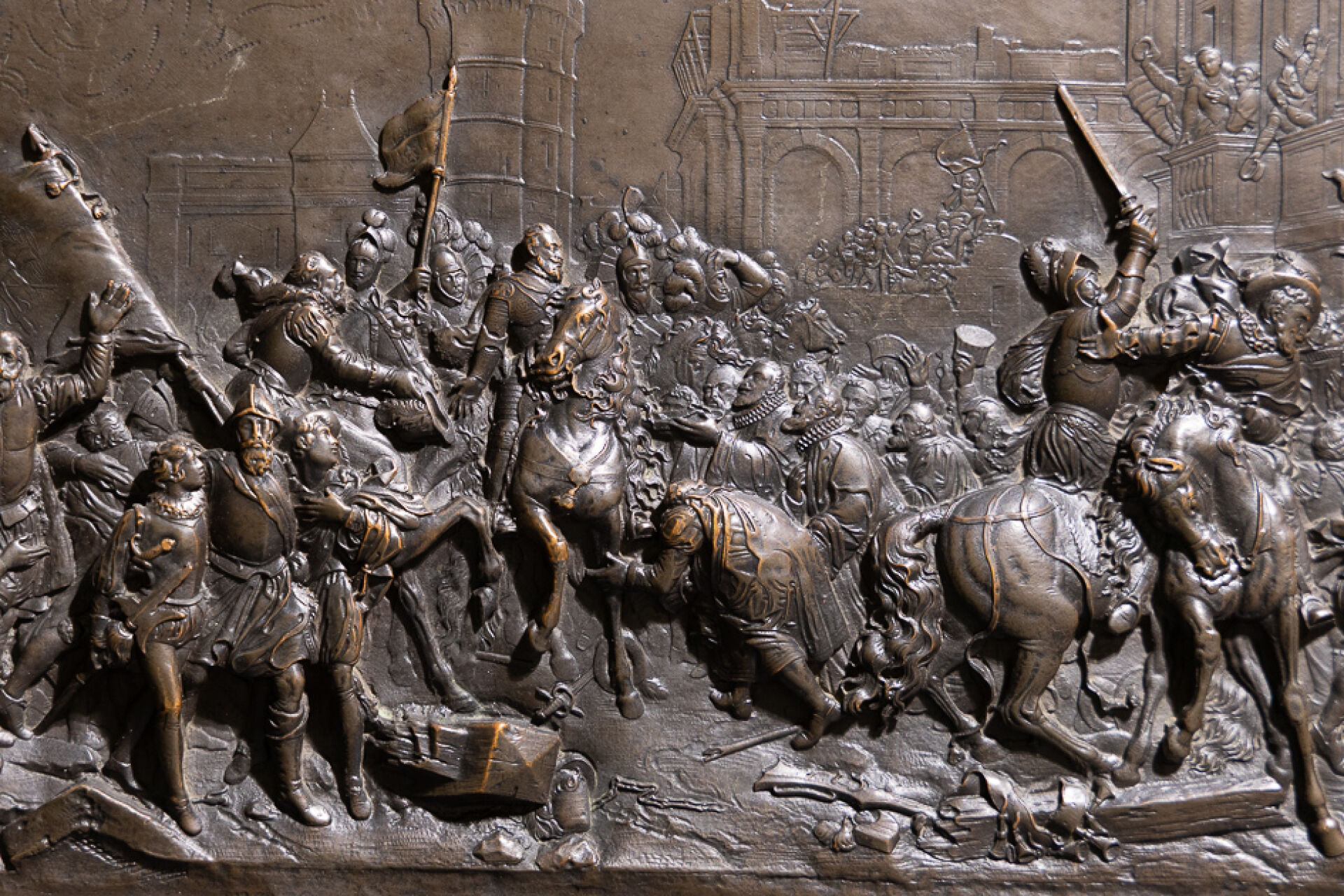École française de la fin du XIXe siècle d'après François GERARD (1770-1837). L'entrée d'Henri IV à Paris, 22 Mars 1594. Bas relief en bronze patiné brun (usures à la patine), présenté sur un panneau en bois (petits accidents aux angles). Haut. : 22 cm - Larg. : 32 cm Oeuvre en rapport : - François GERARD (1770-1837) l'entrée d'Henri IV à Paris 22 mars 1594, 1817, huile sur toile conservée au château de Versailles (INV. MV 2715).