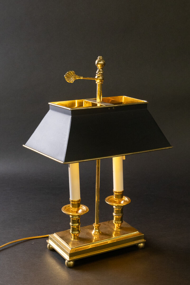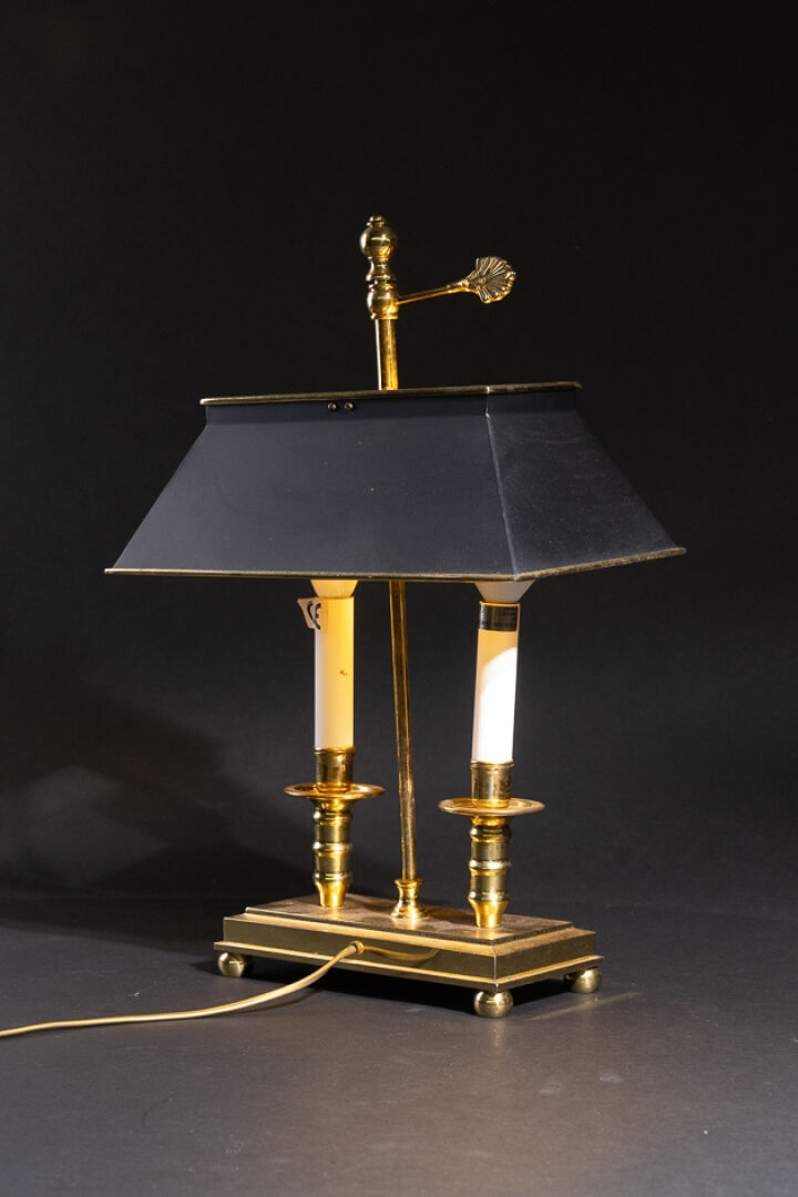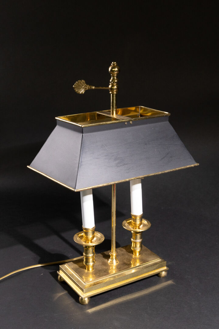 Lampe de bureau style bouillotte en laiton à deux lumières, le socle rectangulaire repose sur des petits pieds boules, l'abat-jour en métal laqué noir réglable en hauteur par une vis en acanthe stylisée, montée à l'électricité (système accidenté). Première moitié du XIX siècle. Haut. : 50 cm - Larg. : 32 cm - Prof. : 19.5 cm