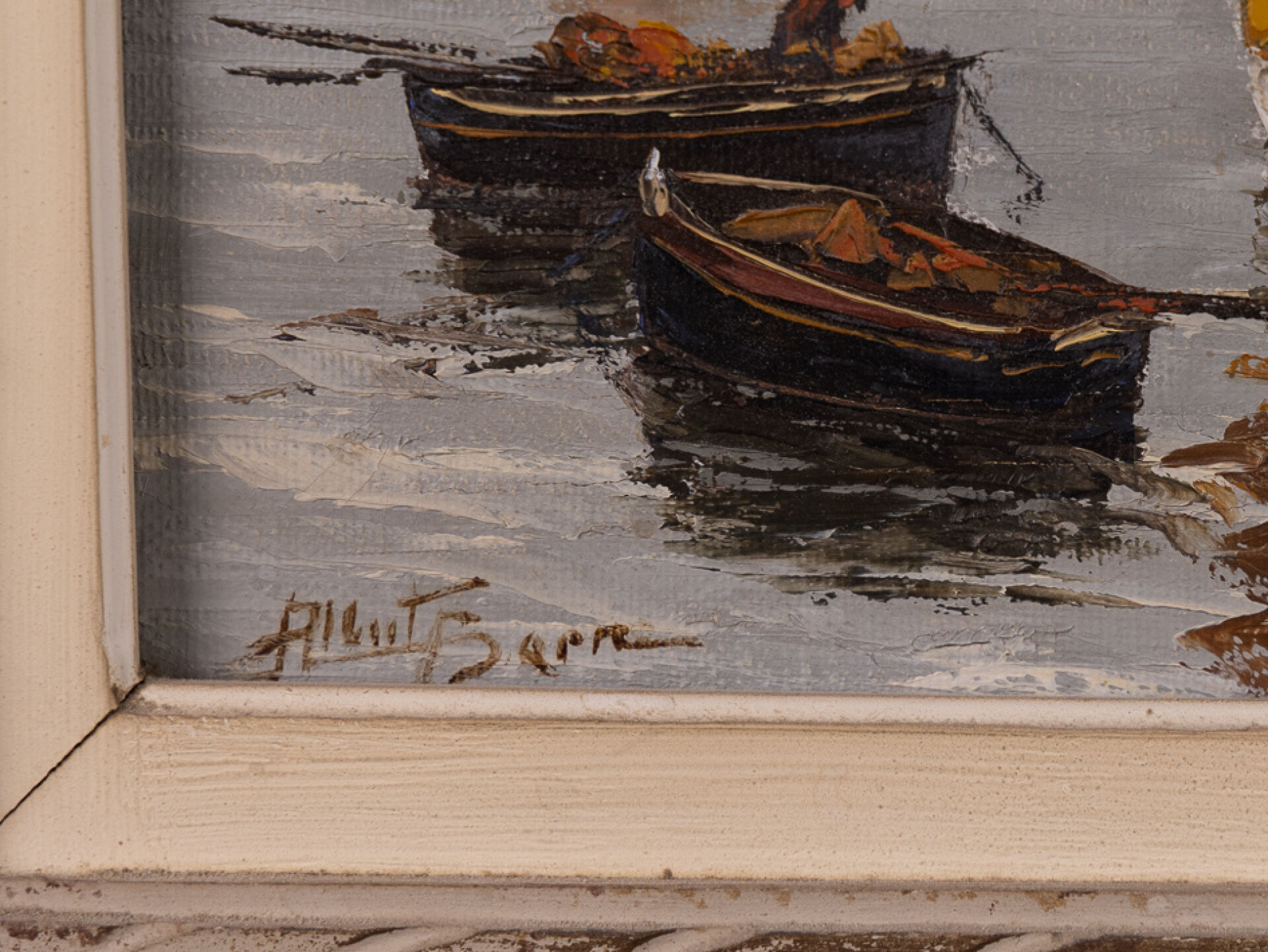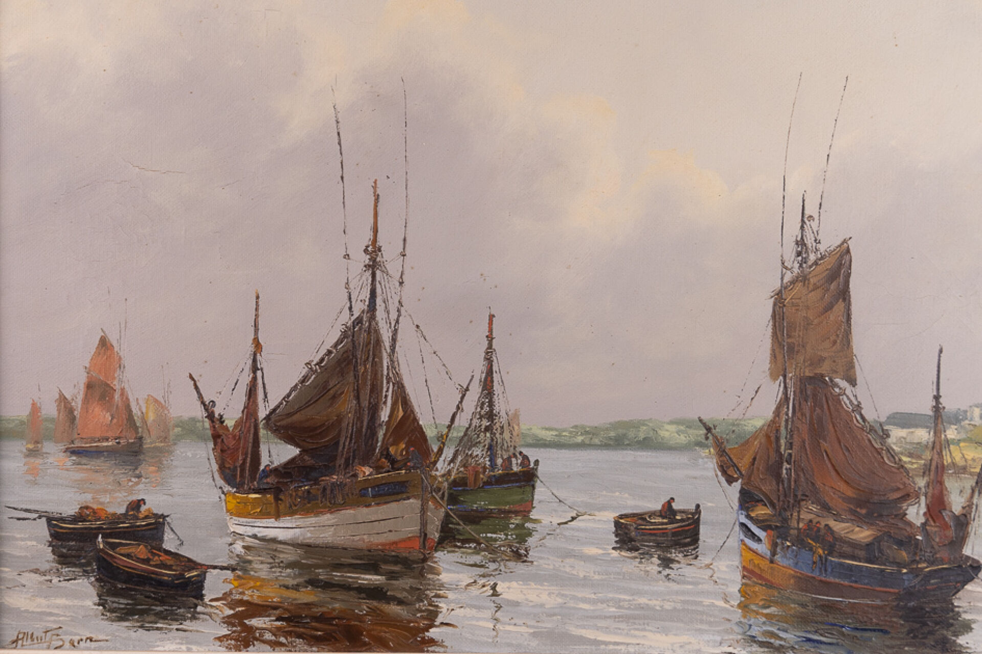 Albert BARRE (XXe siècle). "Thoniers dans une baie de Tréboul ". Huile sur toile, signée en bas à gauche, titrée au revers. Haut. : 46 cm - Larg. : 61. 5 cm