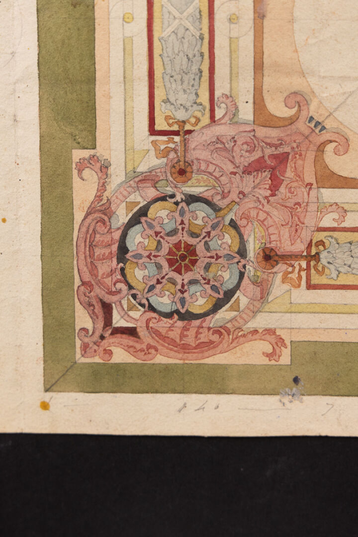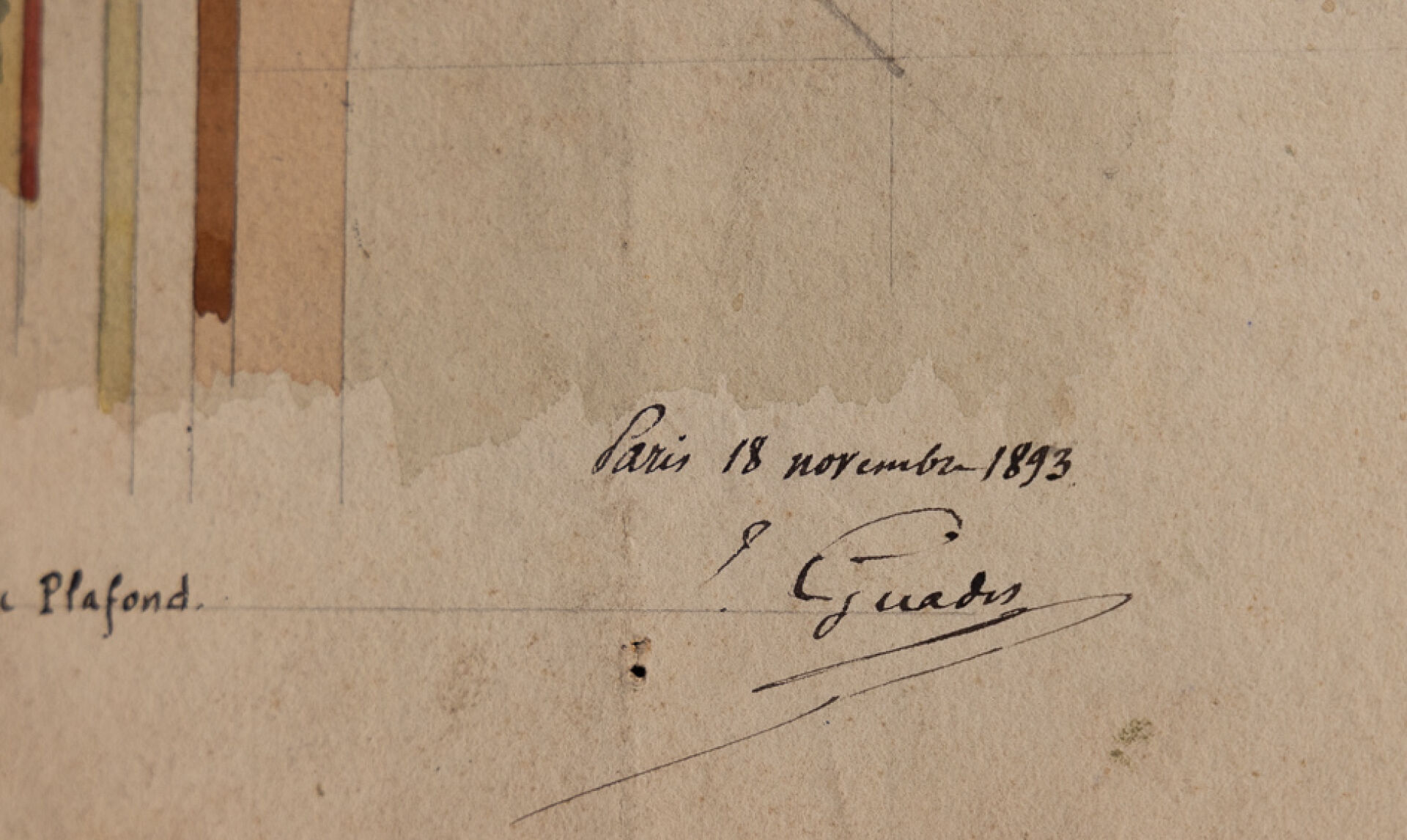 Dans le goût de la Maison JOBBE-DUVAL Projet de décor d'un plafond, d'une corniche et d'un escalier. Esquisse gouachée et annotée, datée PARIS, 18 novembre 1893, signée (insolations). Haut. : 43 cm - Larg. : 30.5 cm
