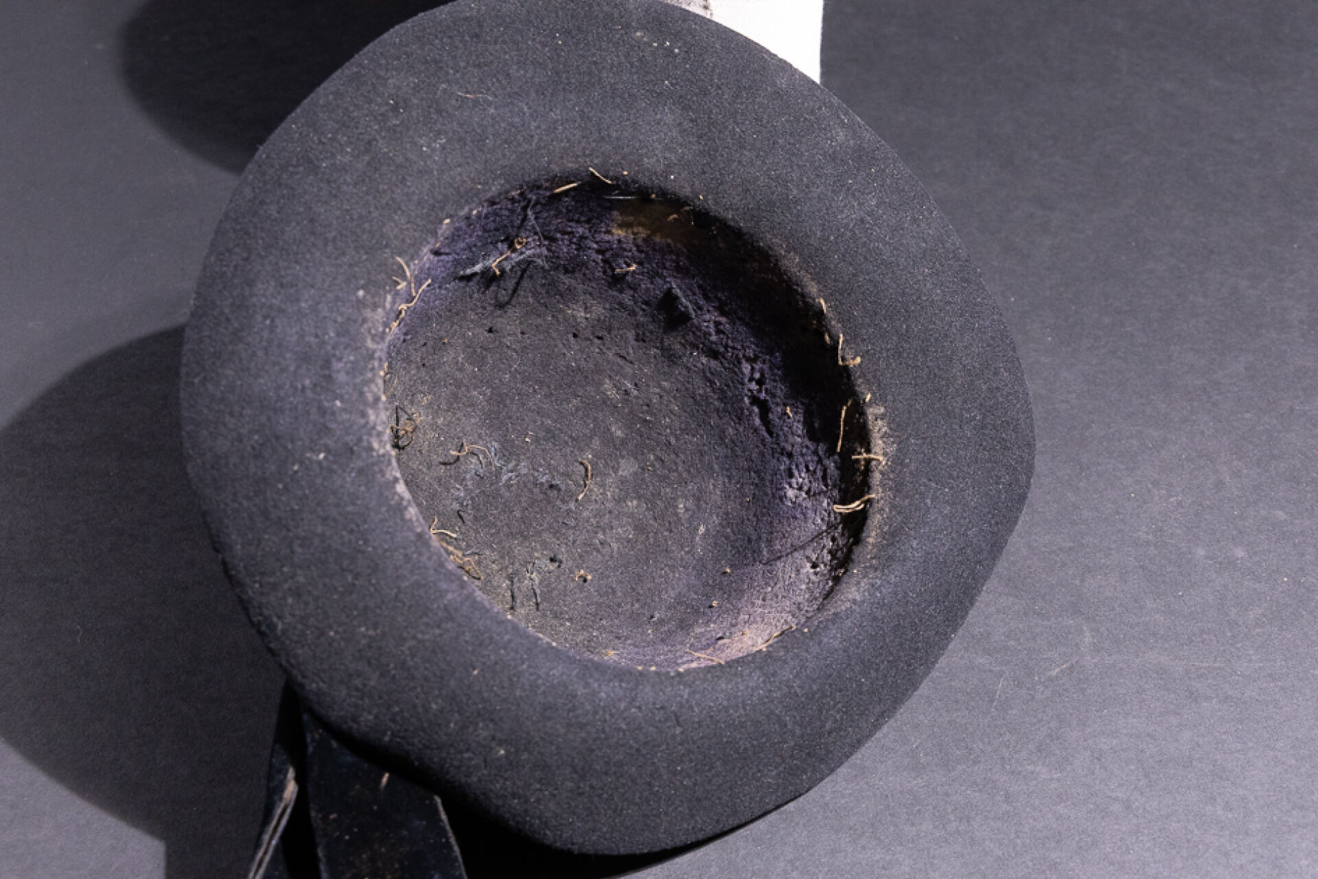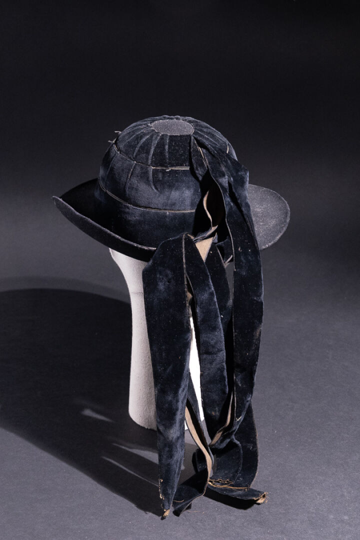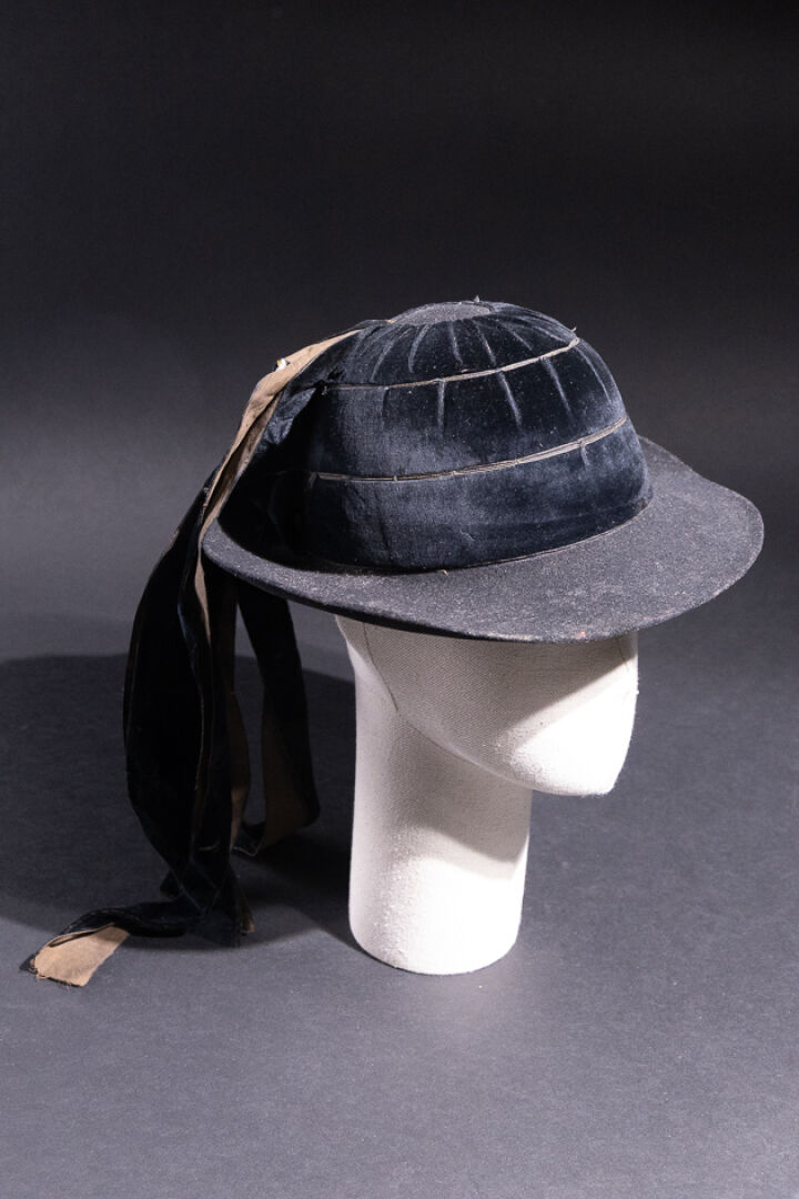 Chapeau d'homme, du pays bigouden, en feutre à trois rangs de rubans de velours avec ses guides en pareil (état d'usage, cuir manquant). Début du XXe siècle. Taille : 57 environ