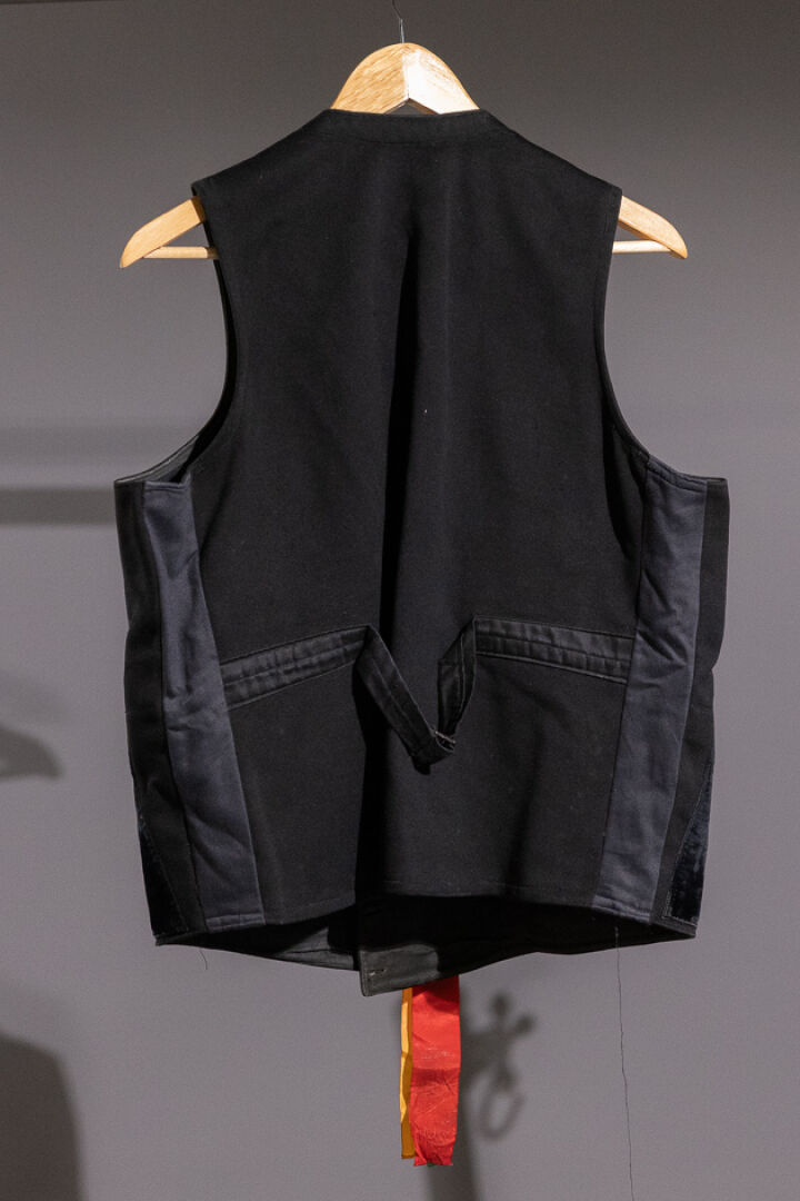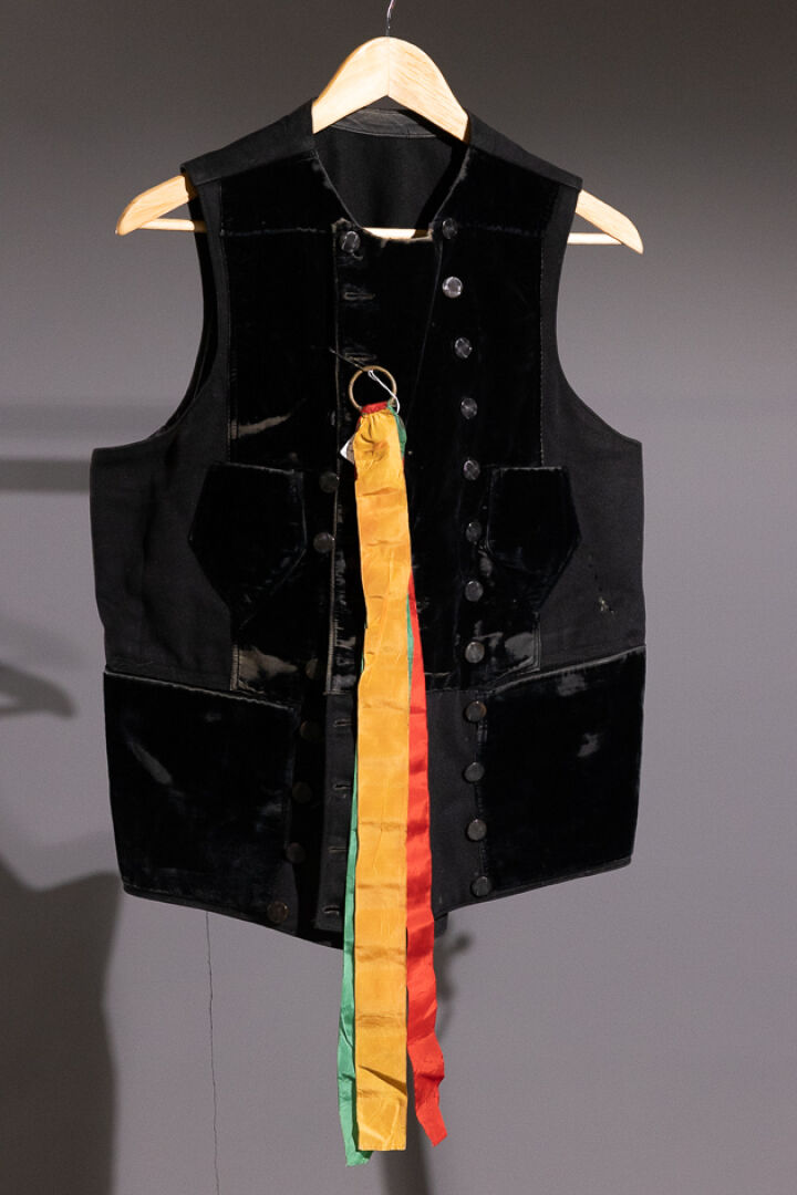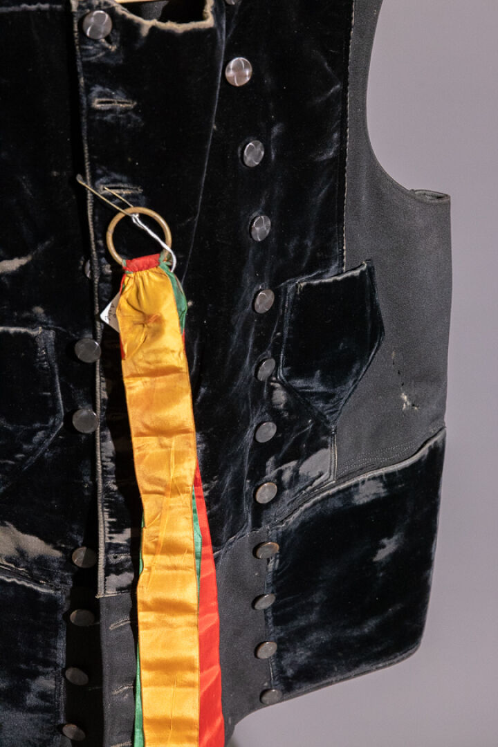Gilet mode du Sud Cornouaille en drap de laine noire à parements et poches en velours, double boutonnage en corozo, dos élargi avec martingale (état d'usage). Début XXe siècle. On joint : Trois rubans jaune, vert et rouge montés sur un anneau métallique.