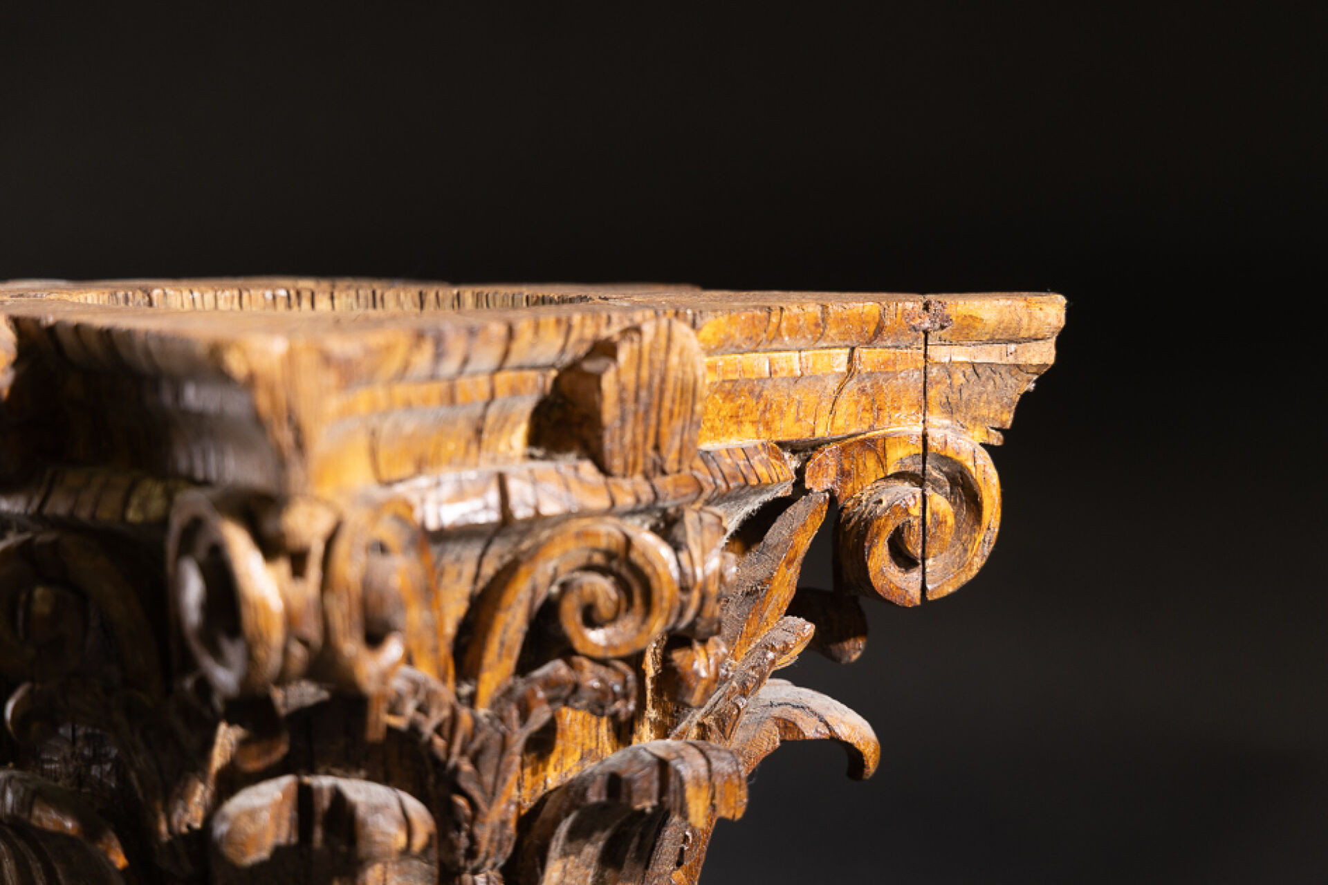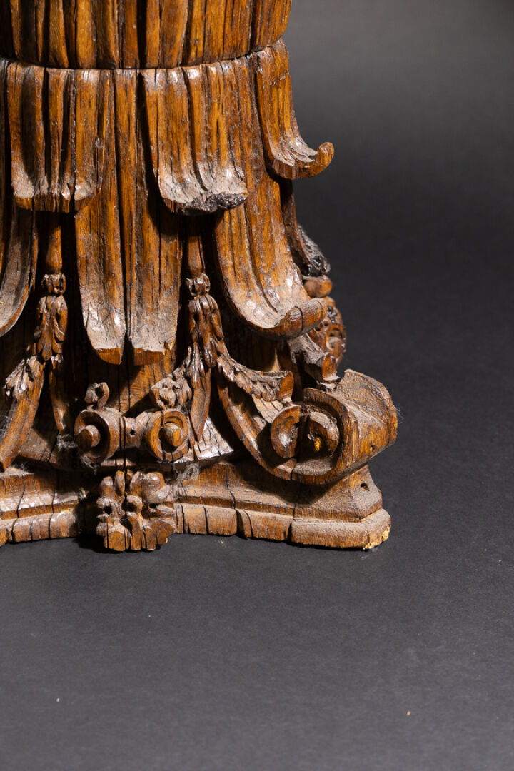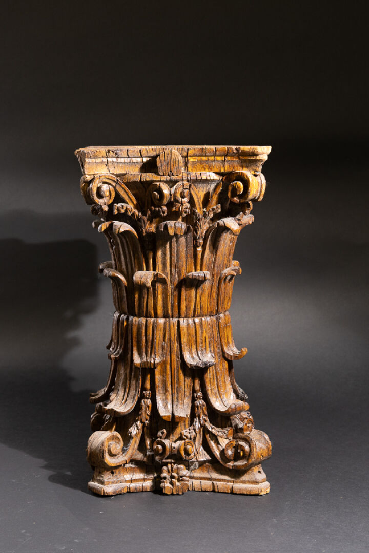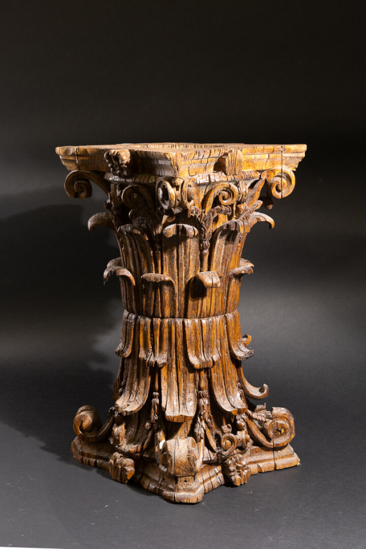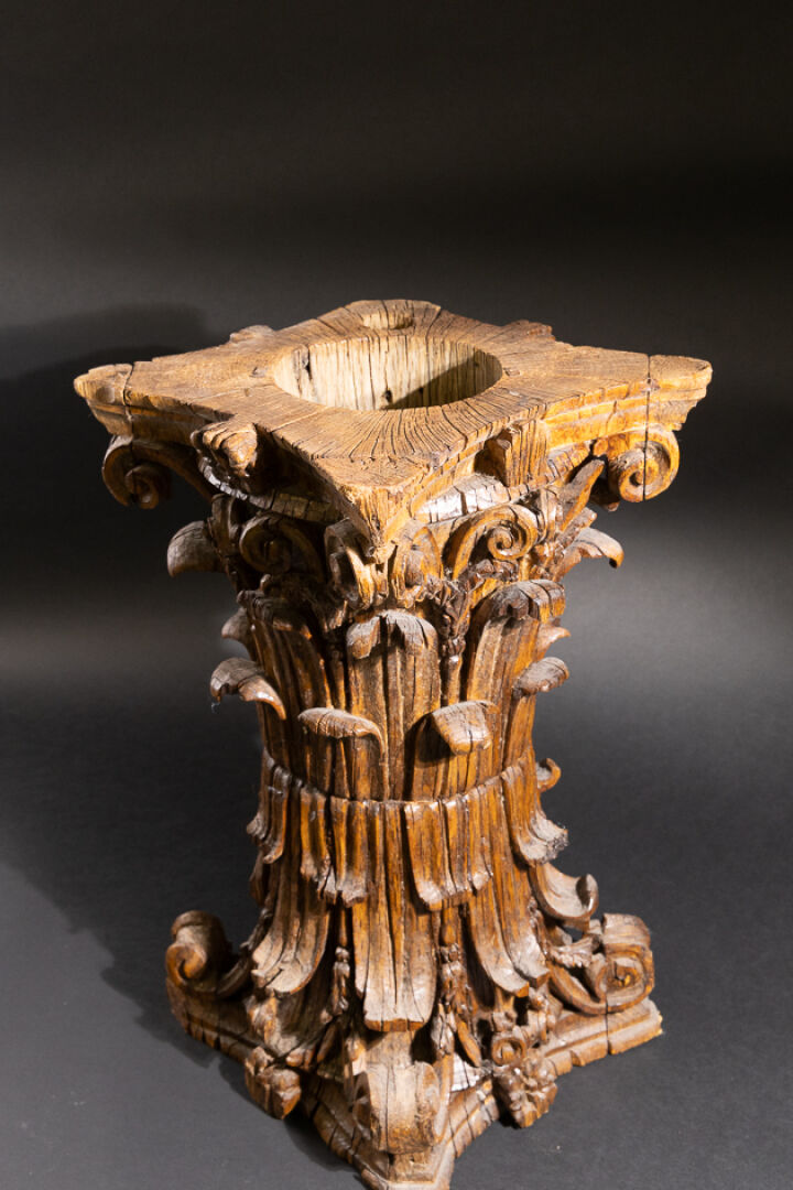 Sellette en bois richement sculpté d'acanthes en forme de deux chapiteaux corinthiens, l'un sur l'autre (accidents, manque le plateau et restaurations). XVIIIe siècle. Haut. : 58 cm - Côté : 34 cm