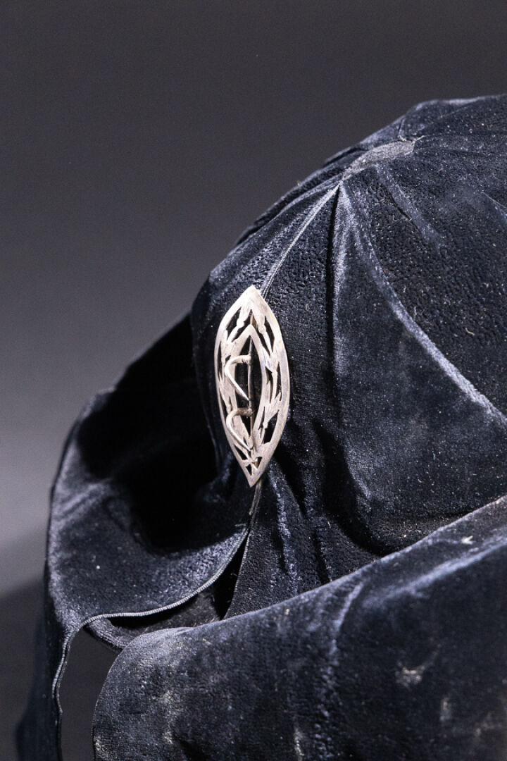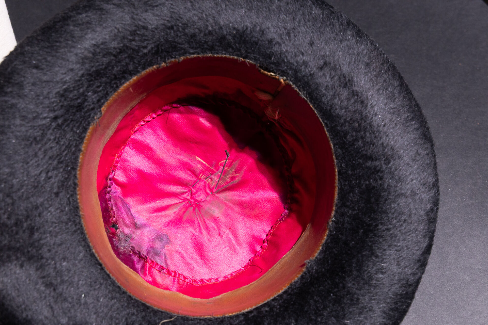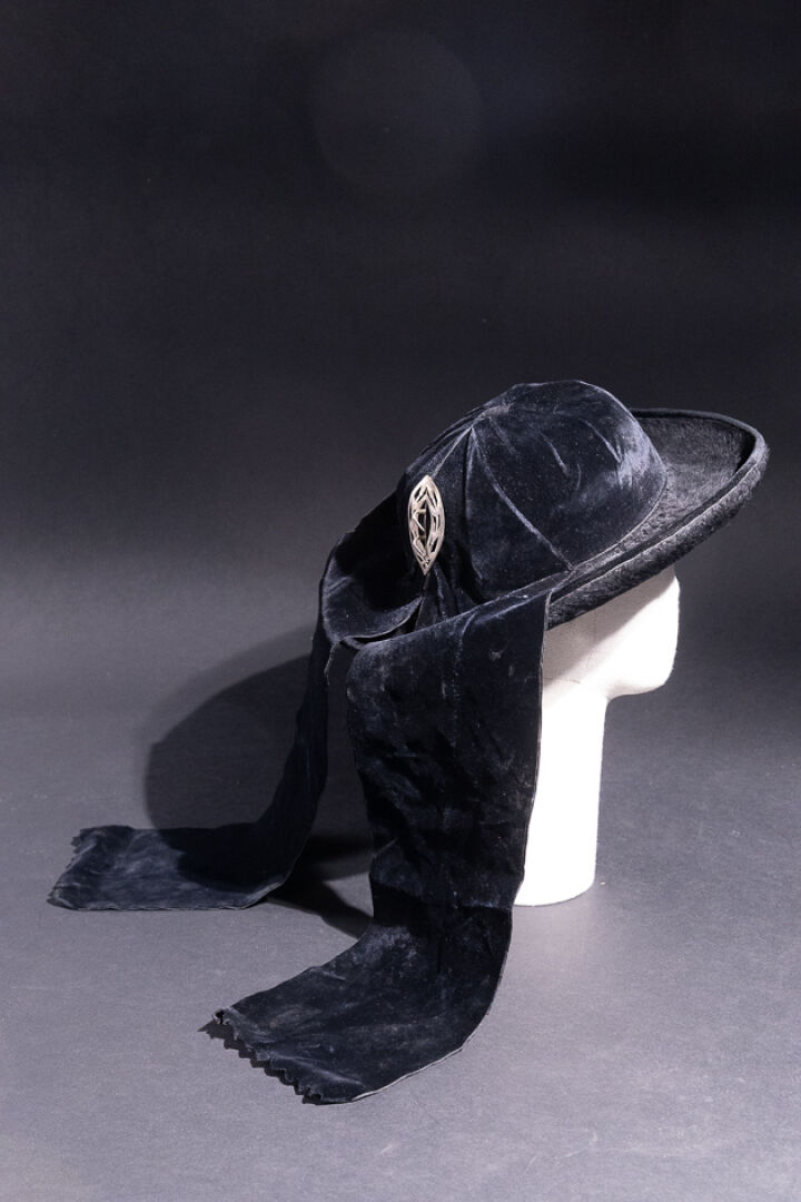 Chapeau d'homme, mode vannetaise, en taupé, large ruban de velours avec guides, ajout postérieur d'une boucle en métal cuivreux (bon état). Début XXe siècle. Taille 54 environ