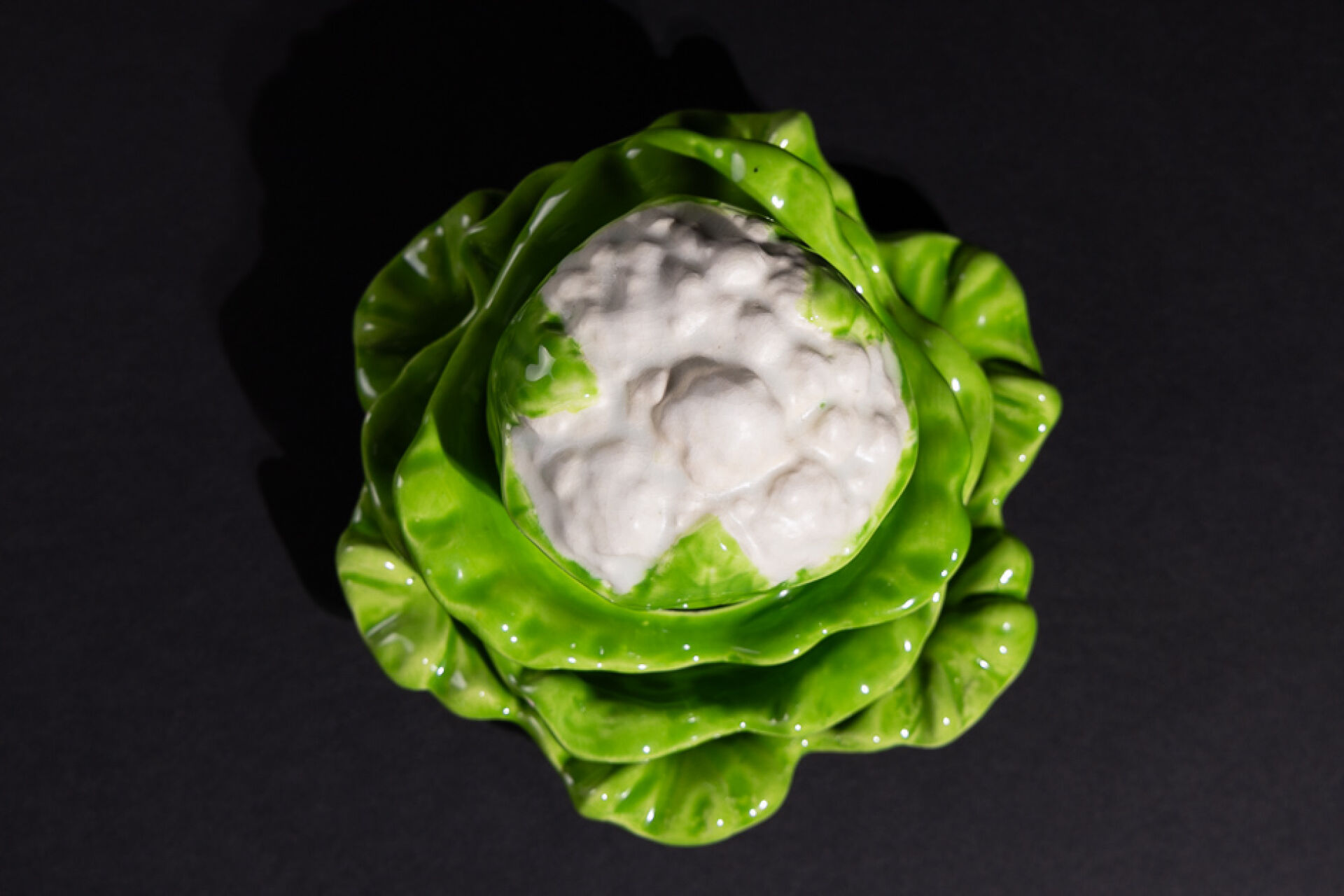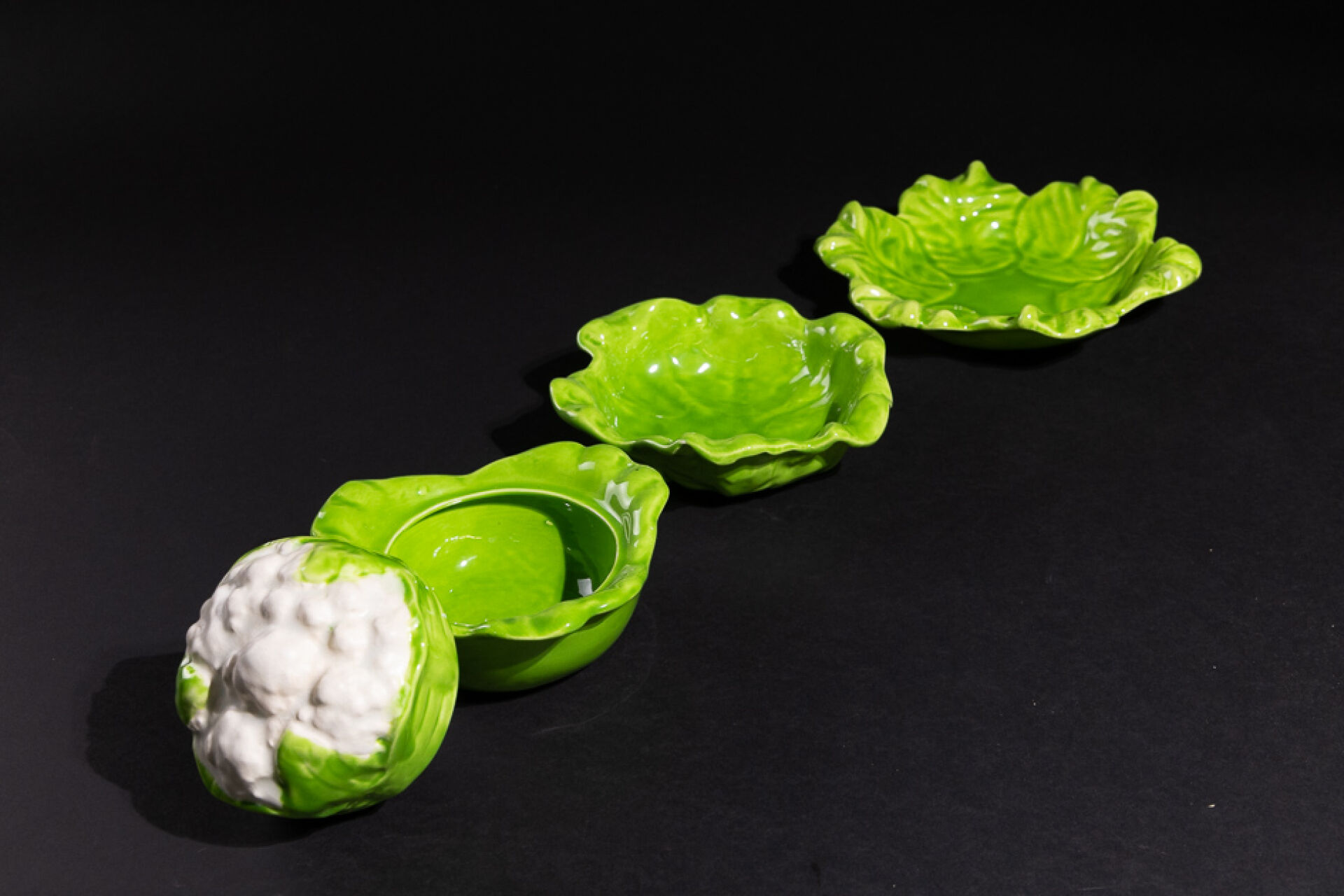 Trois coupes gigognes formant chou-fleur en faïence émaillée vert et blanc. XXe siècle. Haut. : 15 cm - Larg. : 22 cm